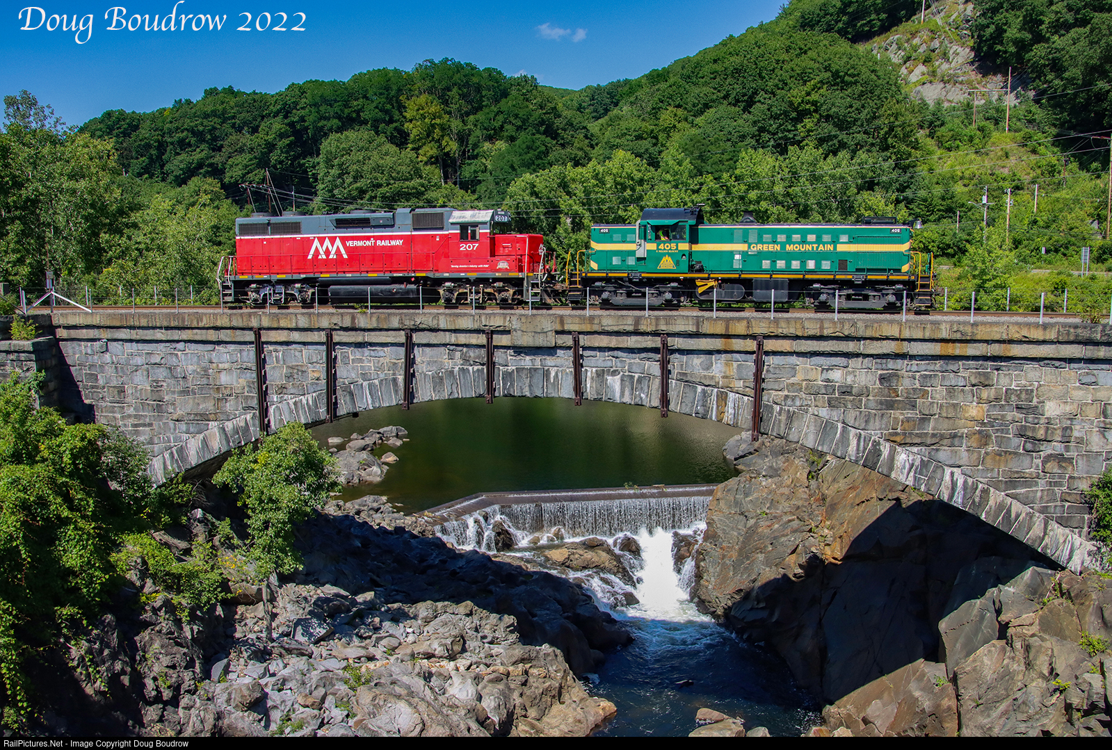 | The Vermont Rail Systems DASW (Bellows Fall Switcher) crew is seen using the 1951 Alco RS-1 built for the Rutland Railroad. As they finish their work day they are bringing VRS 207 over the stone arch bridge from Bellows Falls, VT to North Walpole, NH. The engine came down on road freight 263 dead in tow, destined to be painted at North Walpole. |