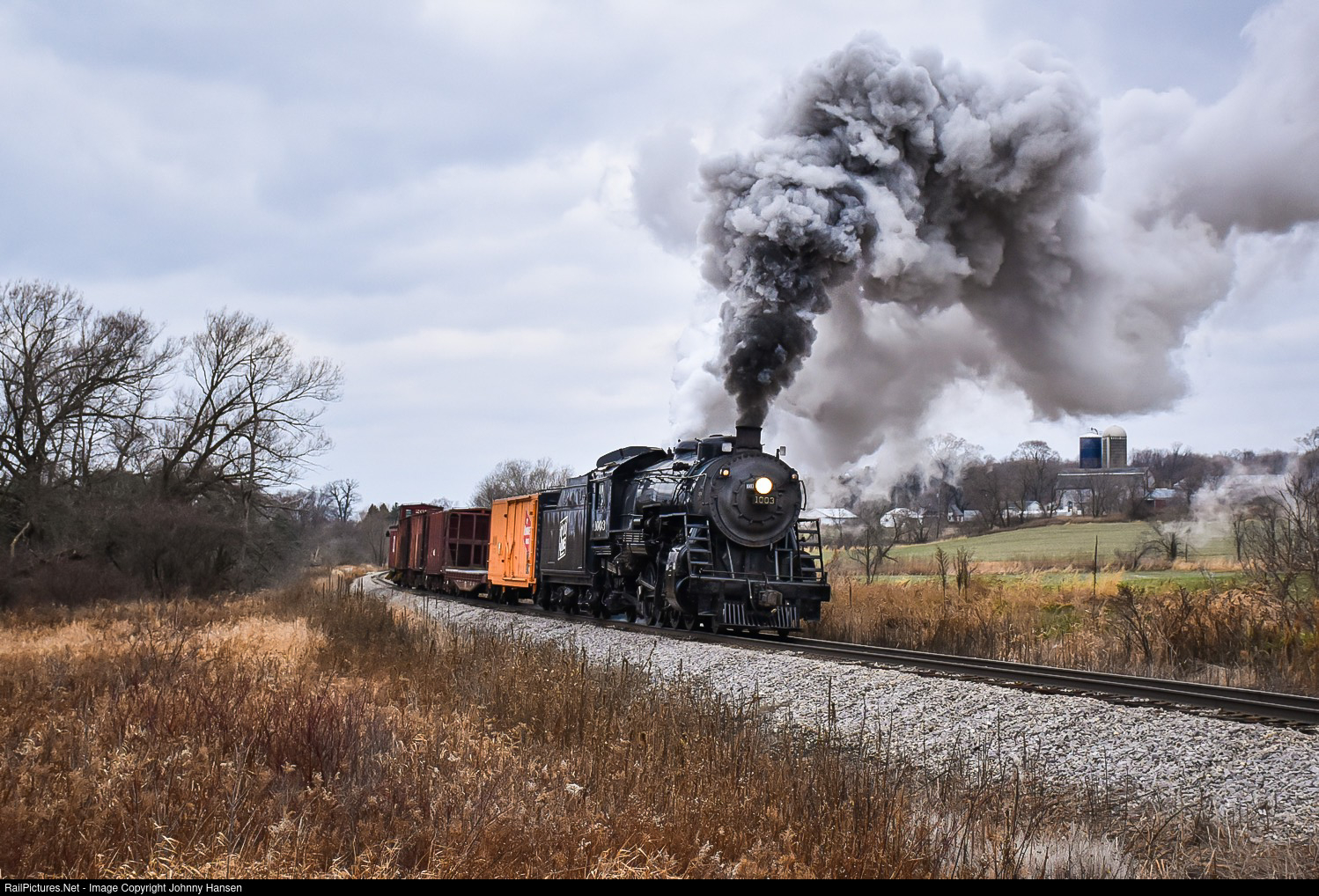 | On a cold and windy November afternoon, SOO 1003 lets out some steam as it thunders into Rubicon around a sweeping curve on the Wisconsin & Southern’s Milwaukee Subdivision.