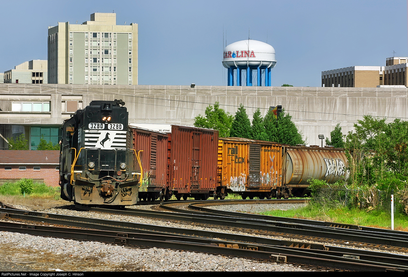 | Norfolk Southern 3280 brings local train P75 through Devine Junction in Columbia, South Carolina to work industry along the former Southern Railway R Line. NS 3280 is an EMD SD40-2 built for Southern in 1978.