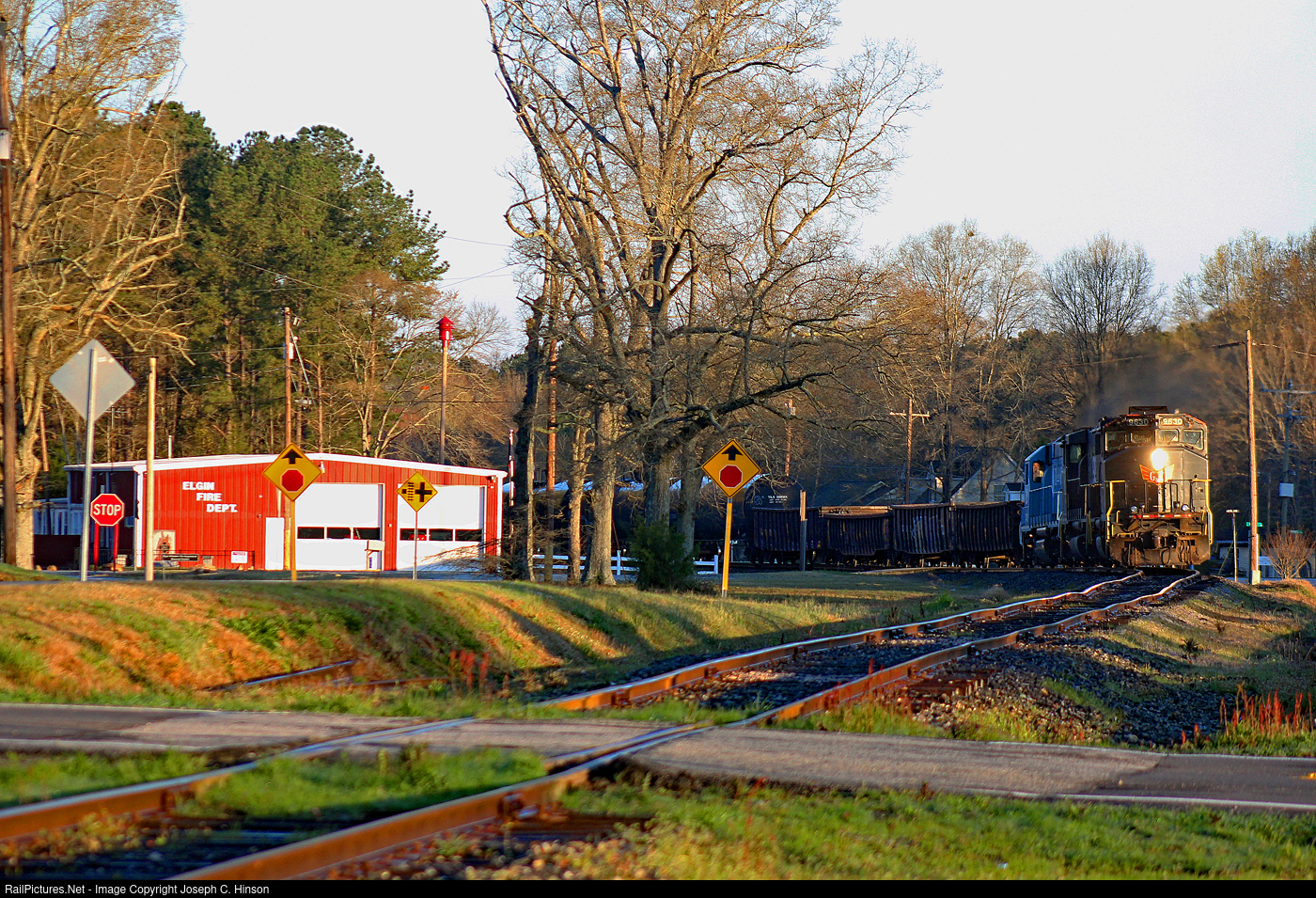 On a chilly morning in late March 2019, Lancaster and Chester Railroad passes the Elgin Volunteer Fire Department in Lancaster, South Carolina. The train left their office in downtown Lancaster so early that the sun is still not up high enoigh for even lighting through the scene. This was mercifully the last spot we shot at where the (lack of) sun was an issue.