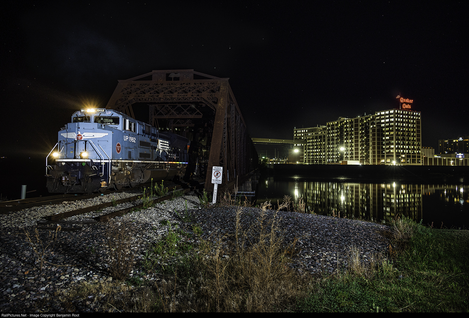 On September 5, 2022, a derailment, bridge collapse and subsequent liquid asphalt spill over Spring Creek near Hampton, Iowa caused several Union Pacific trains to detour across Iowa Northern trackage down to Cedar Rapids, Iowa. Seen here, UP 1982 leads MSSDMX 04 across the Cedar River via the former CNW "Quaker Oaks" truss bridge, from North Yard to Beverly Yard. Oddly enough, three engines (UP 6284, UP 1982, CP 7056) actually came into Cedar Rapids on MITPS 06, but were left in North Yard. The CP unit was left behind at the yard when MSSDMX was pulled out - UP 1982 and UP 6284 are the power. More detours would follow, but nothing quite as intriguing as 1982 leading down the CR industrial track! Thanks for looking.