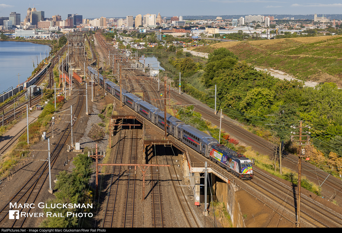 Rushing To Swift. On the morning of Saturday, September 3, 2022, NJTR 4609 (Ride With Pride, ALP-46, Bombardier) led train NJ TRANSIT 7814 from Trenton, NJ to New York Penn Station in New York, NY. The train is seen on the “Sawtooth Bridge” in Kearny, New Jersey approaching Swift Interlocking. Sponsored by Hackensack Meridian Health, the design is similar to that of 2 buses that were wrapped during Pride Month in June and uses the name of the Company Employee Resource Group (CERG) for the LGBTQIA+ Community, Ride with Pride.