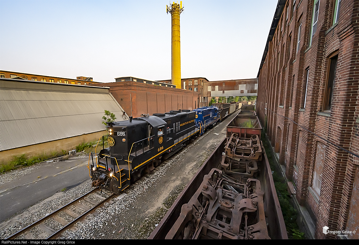 As the sun sets on September 9th, 2022, the Naugatuck Railroad freight job, with EMD GP9s NAUG 686 & 859 on the point, haul sixteen cars north through the former American Pin Company factory complex on the Waterbury Branch in the Waterville area of Waterbury, CT.