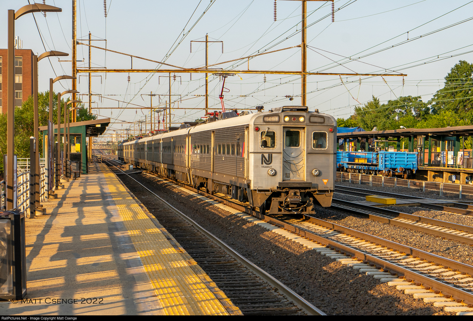 NJT Arrow III no. 1491 (GE, 1977-1978) is leading a train through Linden Station in the early evening as the sun begins to set. Also visible here is an Amtrak platform gondola, which is positioned on Track 1 allowing trains to board from the express track while maintenance work is being performed. |