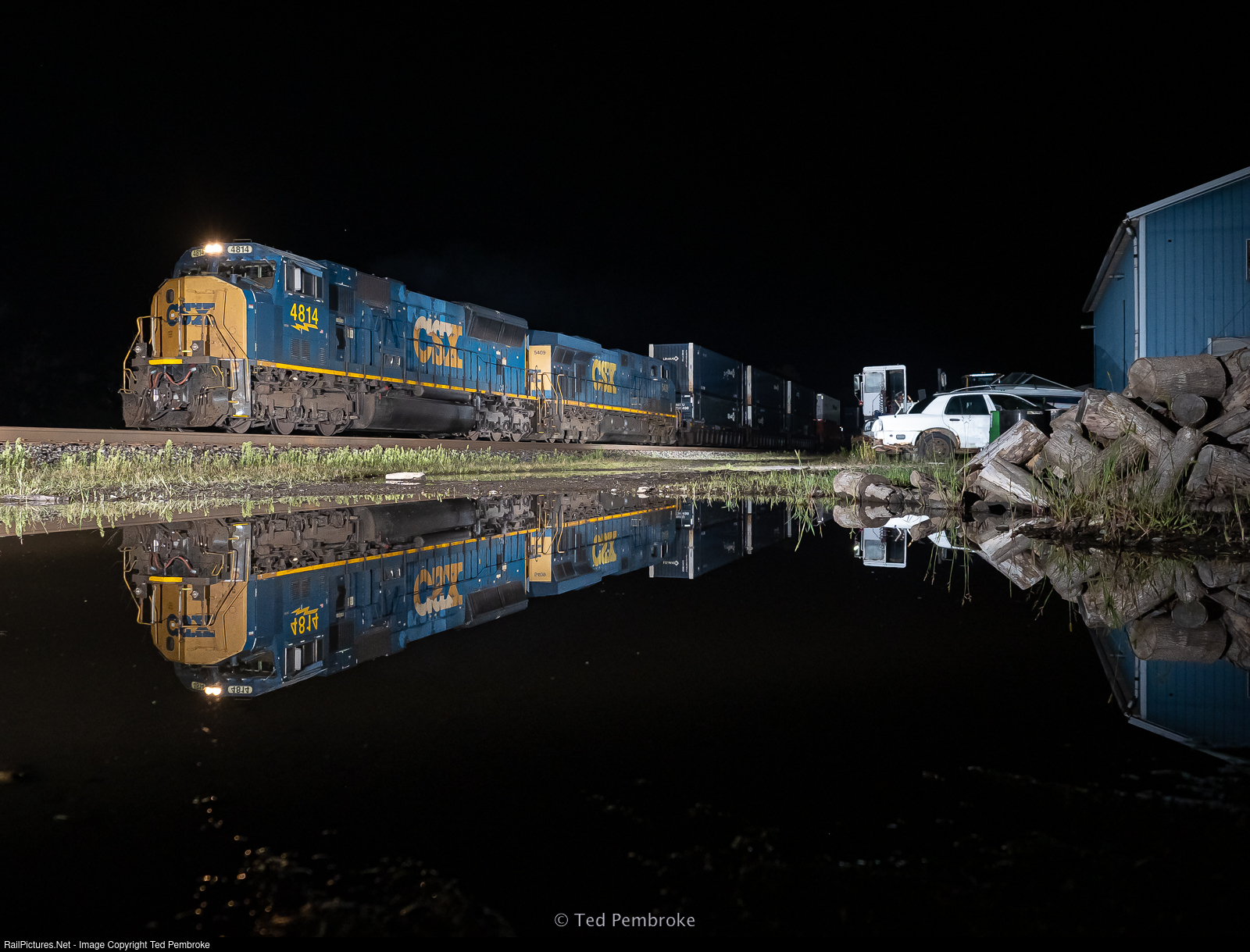 A double look at CSXT 4814 Charging intermodal freight thru the night in Wayne County.