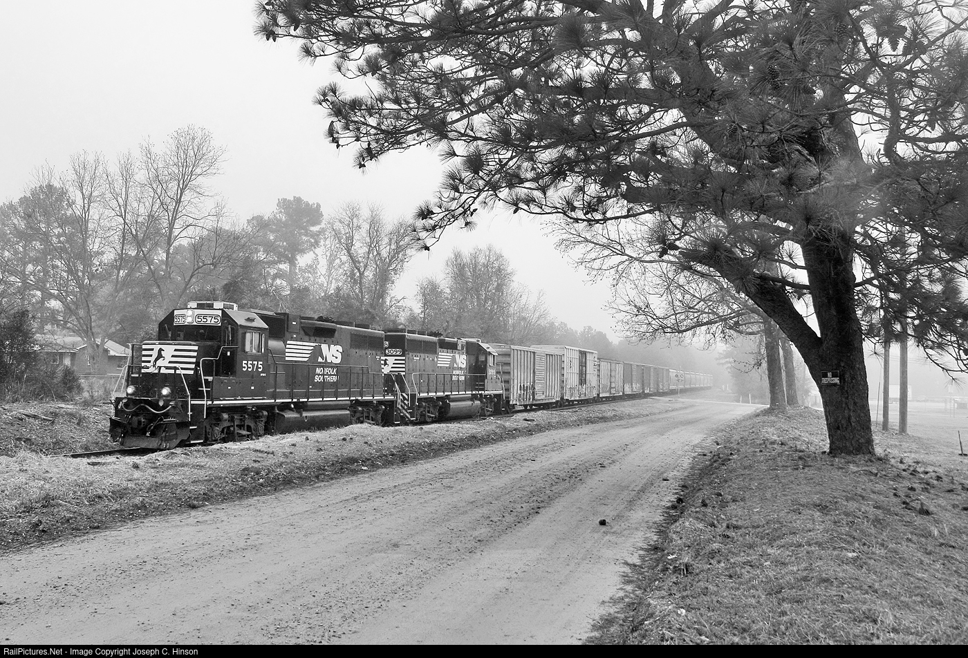 | Norfolk Southern local P77 trudges slowly through the fog in Cayce, SC enroute to Edmunds. The train is led by Norfolk Southern (NS) 5575. It was built by EMD in 1971 as Norfolk & Western (NW) 4145, to NS 4145. It was rebuilt to GP38-2 specifications and sold to First Union Rail and leased back to Norfolk Southern. That lease has since expired and gone back to FURX.