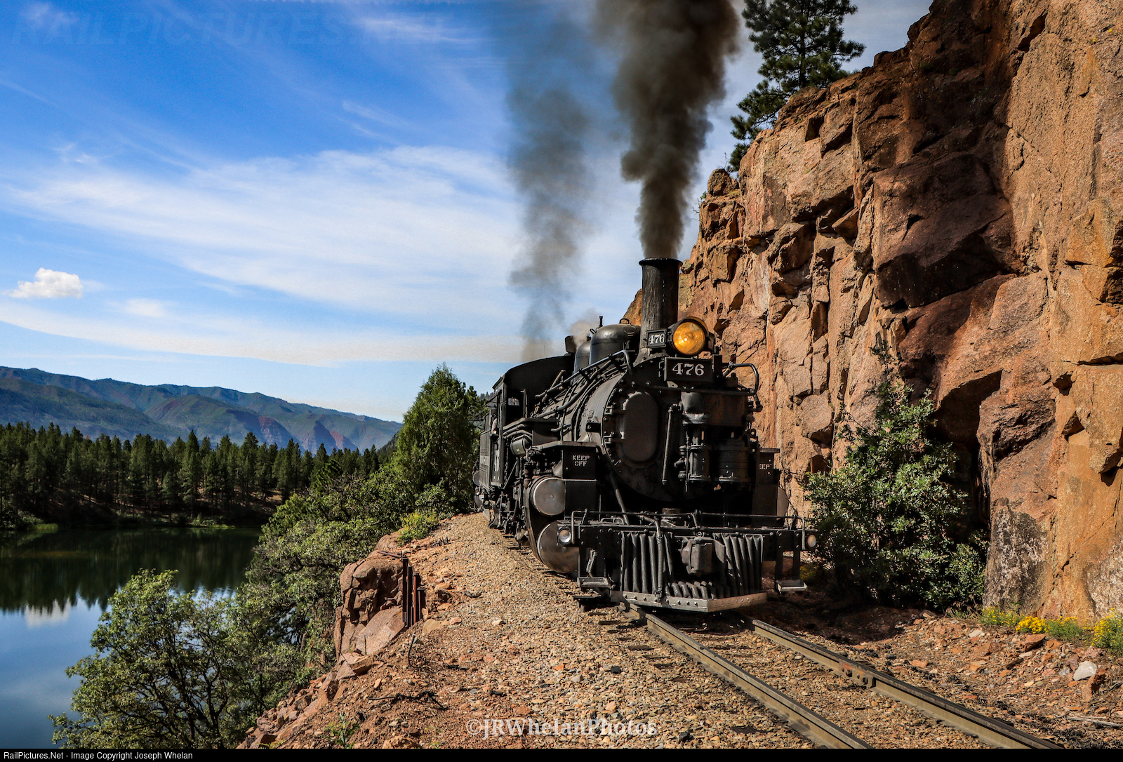"Soaring above Shalona Lake" - Durango and Silverton 476 and 473 hug the cliff as they work upgrade past the beautiful Shalona Lake.