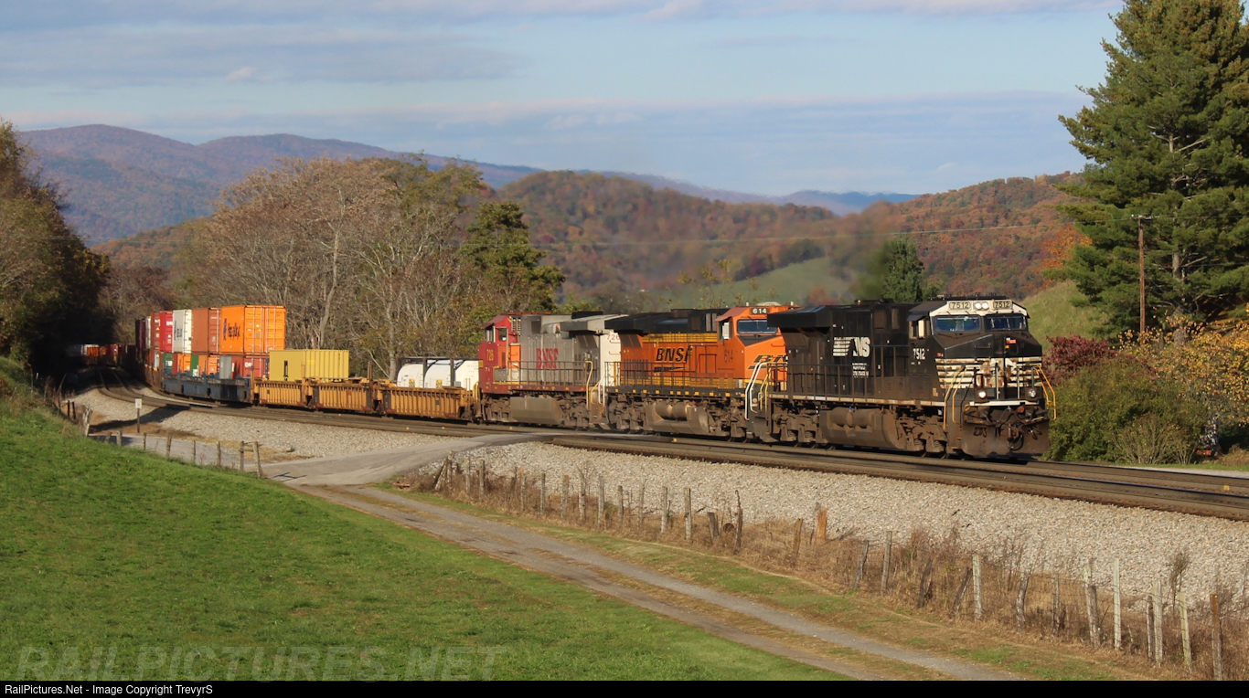 | NS 22A tackles the steep Christiansburg Grade at Shawsville, VA with a BNSF rebuild in second position and a BNSF "Fakebonnet" trailing third. |