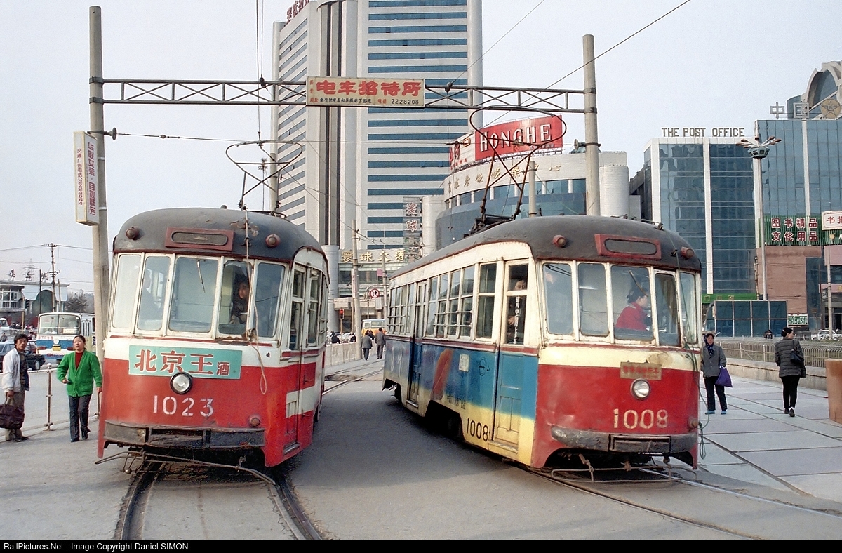| Meeting of two Anshan streetcar oldies near the railway station. Anshan is located 55 miles southwest of Shenyang on the old South Manchurian Railway line. A single tramway route was opened in 1956 to provide transportation for the employees of the Anshan Steel Works. Anshan`s tramway line was closed in April 2003. |