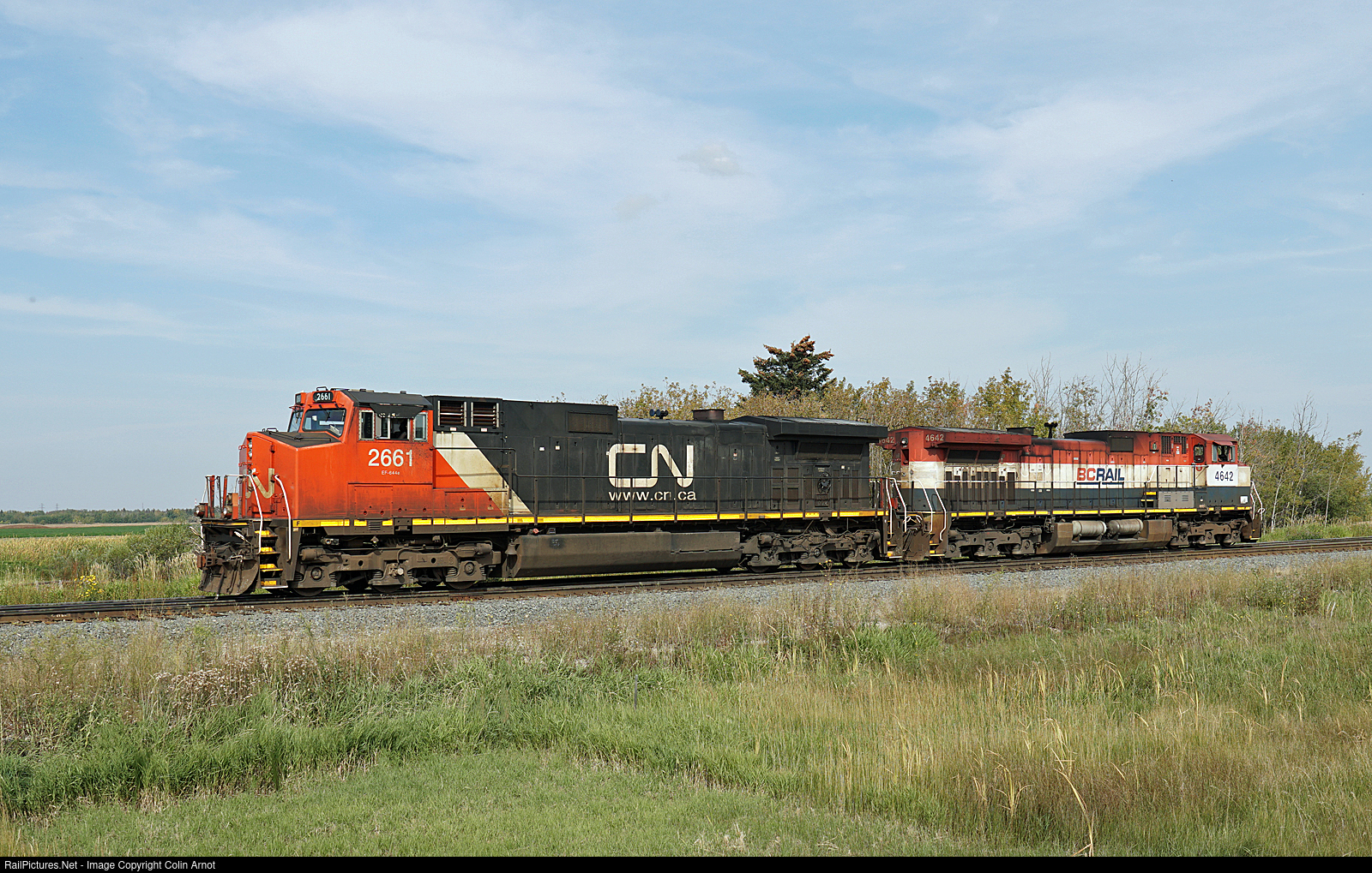 | CN 2661 and BCOL 4642 make a light engine move into Scotford Yard. They have been working at the Heartland Sulphur Terminal a couple of miles to the east and are returning to the yard shop tracks for a break. Nice to see the old BC paint scheme, getting pretty rare these days. |