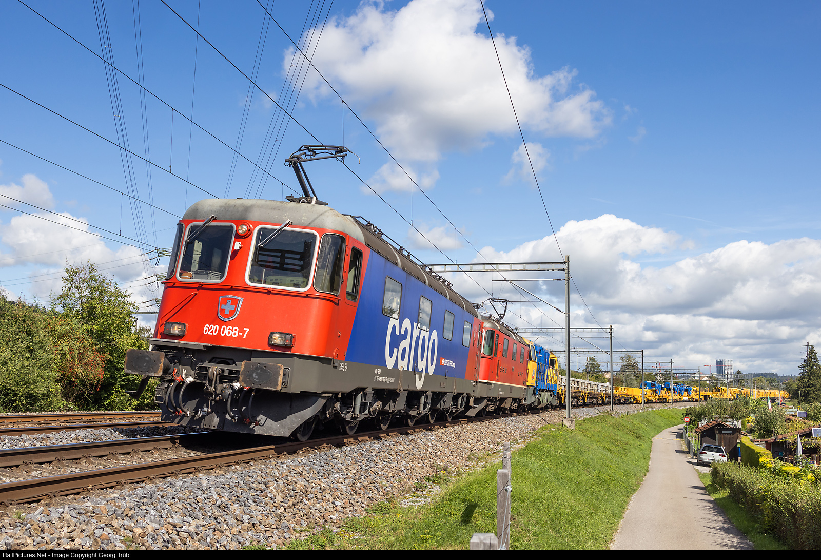 Re 620 # 068 "Stein-Säckingen" (Re 6/6 # 11668) and Re 420 # 269 (Re 4/4 II # 11269) of SBB Cargo in multiple control (called "Re 10/10" with about 17000 HP) are pulling the 639 meter long and nearly 2000 ton heavy freight train 69441 from Winterthur West (freight yard) via Kloten-Zürich Oerlikon to the Limmattal shunting yard (RBLU) between Winterthur and Winterthur Tössmühle. The train includes two "Scheuchzer" diesellocomotives Am 840 # 001 and # 002 "Rhino" (former SBB Cargo Italy) and the "Puscal S" track rebuilding machines, used between Hettlingen and Winterthur. The train circulated under responsibility of the BauRail railway, sister of TransRail, the locomotives were rented short time from SBB Cargo.