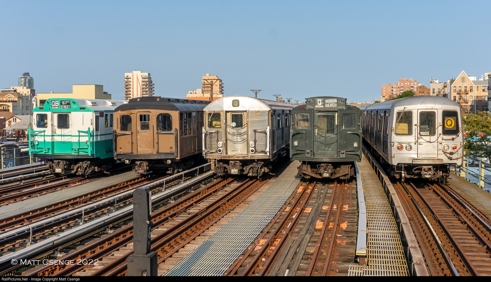 Five generations of B Division cars are seen lined up at Ocean Pkwy station at the end of the first day of the Parade of Trains.