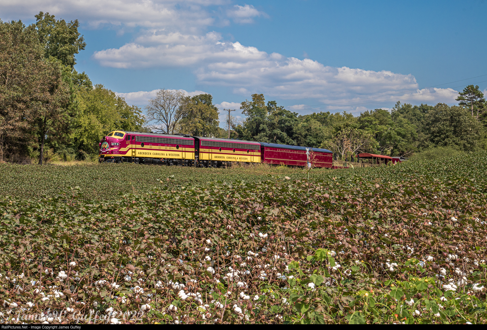 Aberdeen, Carolina, and Western's former NS F9A/B set rolls westbound by a cotton field just east of Oakboro.