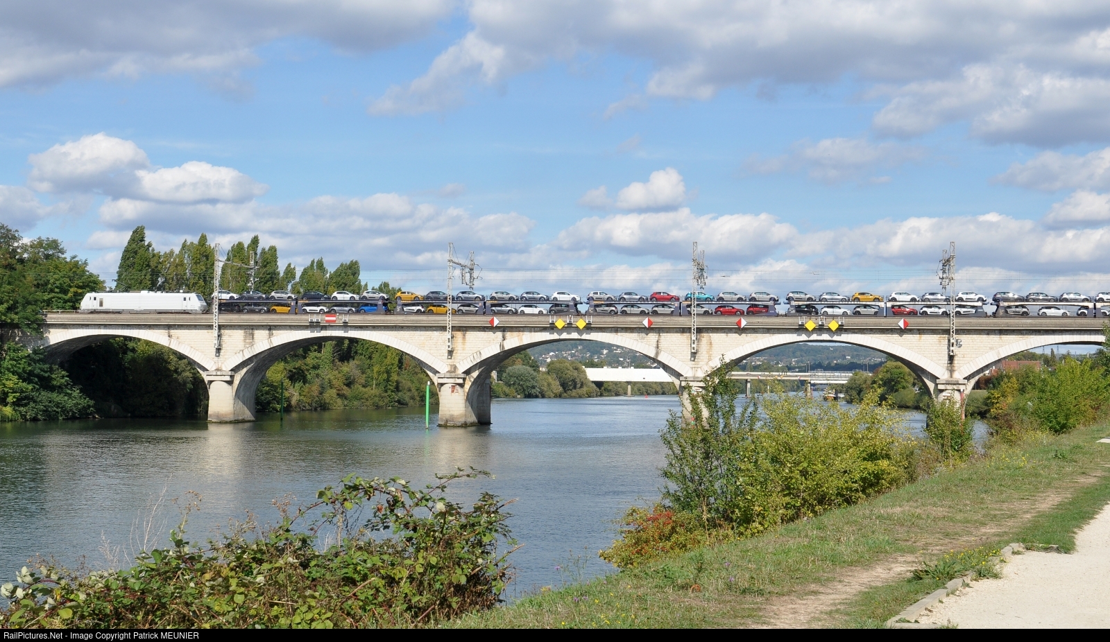 This full cars-carrier is passing over the river Seine on the bridge of Sartrouville. It is heading Le Havre from Strasburg-Hausbergen.