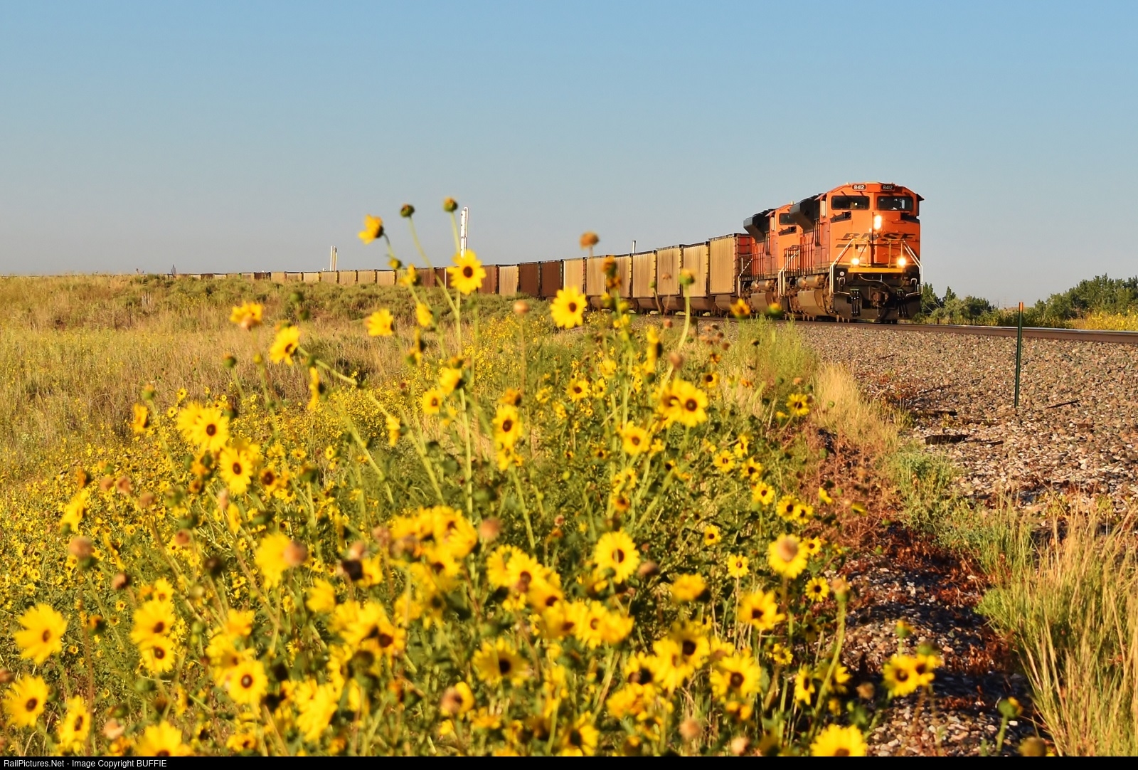 | Wild sunflowers grow along the Brush Sub track as BNSF 8412 (SD70ACe) leads a coal train towards Roggen, Colorado.