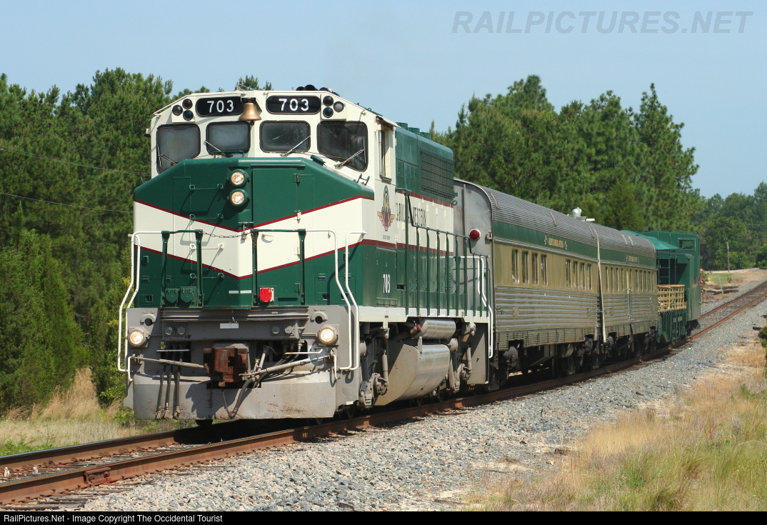 Excursion train to Aberdeen is heading down the well-kept mainline with two ex-Florida Central coaches as part of the consist. #703 is is ex-Go Transit/Tri Rail.