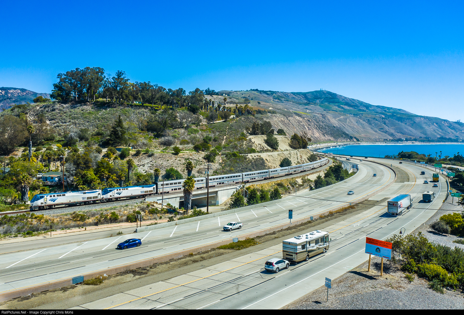 Northbound Amtrak No. 14 the northbound Coast Starlight to Seattle Washington with GE P42DC No. 181 leading, rounds Rincon Point next to Hwy 101 on the Santa Barbara Subdivision.
