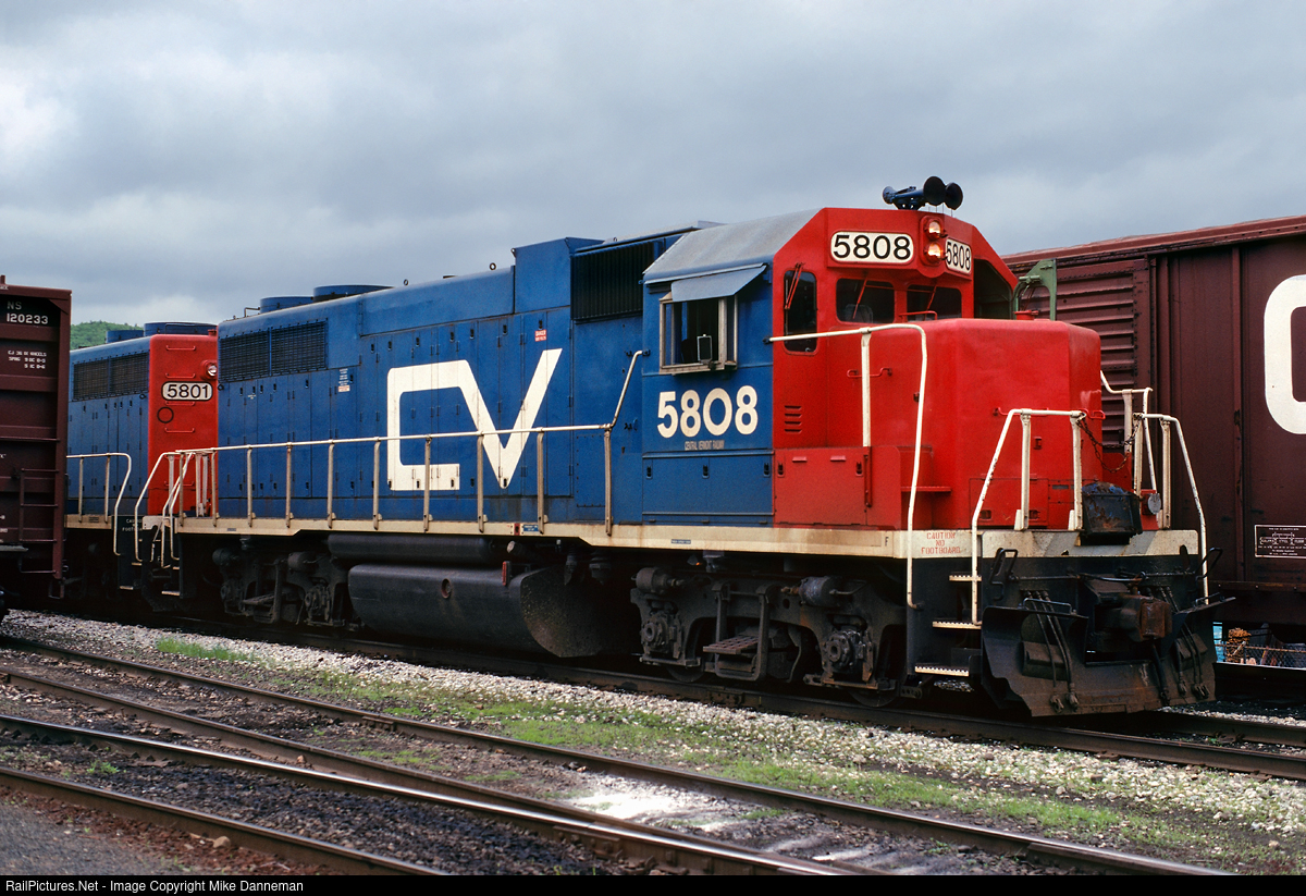 In early 1971, EMD began offering the option of an AR10 alternator in place of standard D32 direct-current generator in GP38 and SD38 models, with these locomotives designated as GP38AC and SD38AC versions. On May 20, 1993, Central Vermont Railway GP38AC No. 5808 waits for a new crew at Palmer, Massachusetts.