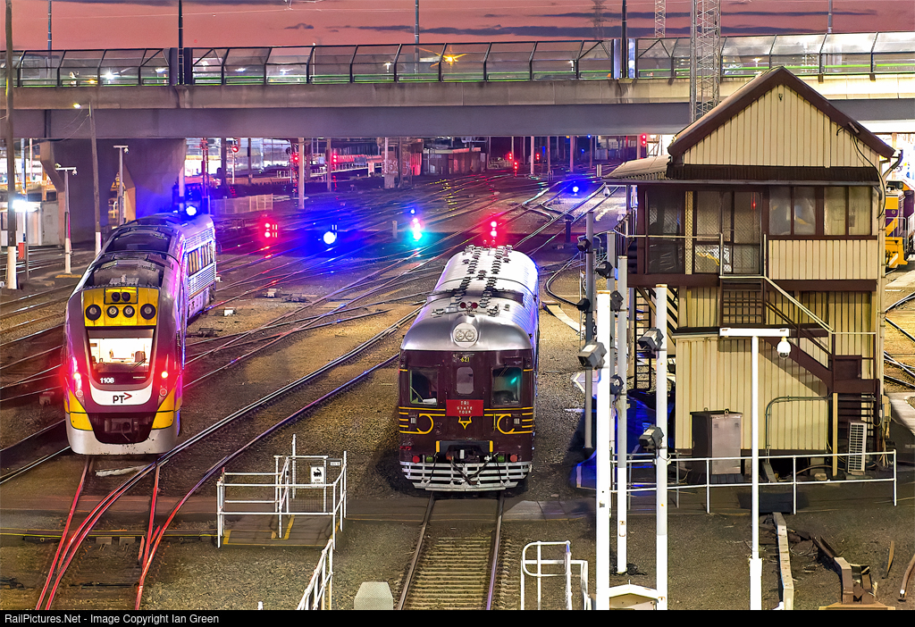 VLocity set VL08 passes stabled railmotors 621/721 at Southern Cross Station.