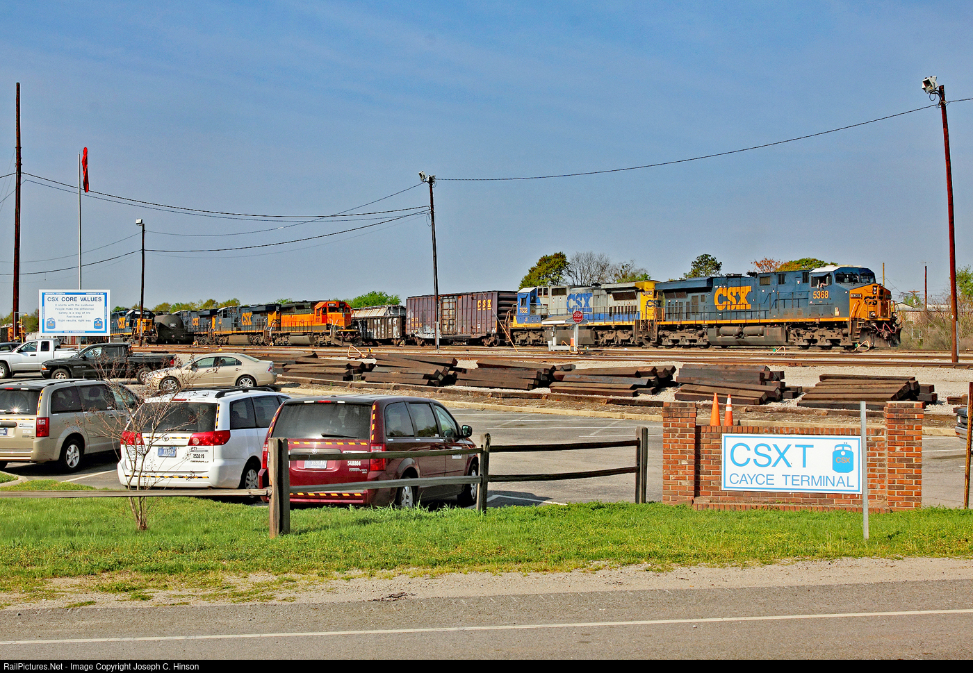 | A gaggle of CSX trains are at the rail yard in Cayce, South Carolina in 2012. A crew is onboard the train with CSX #5368 leading making a few switching moves within the confines of the yard. |