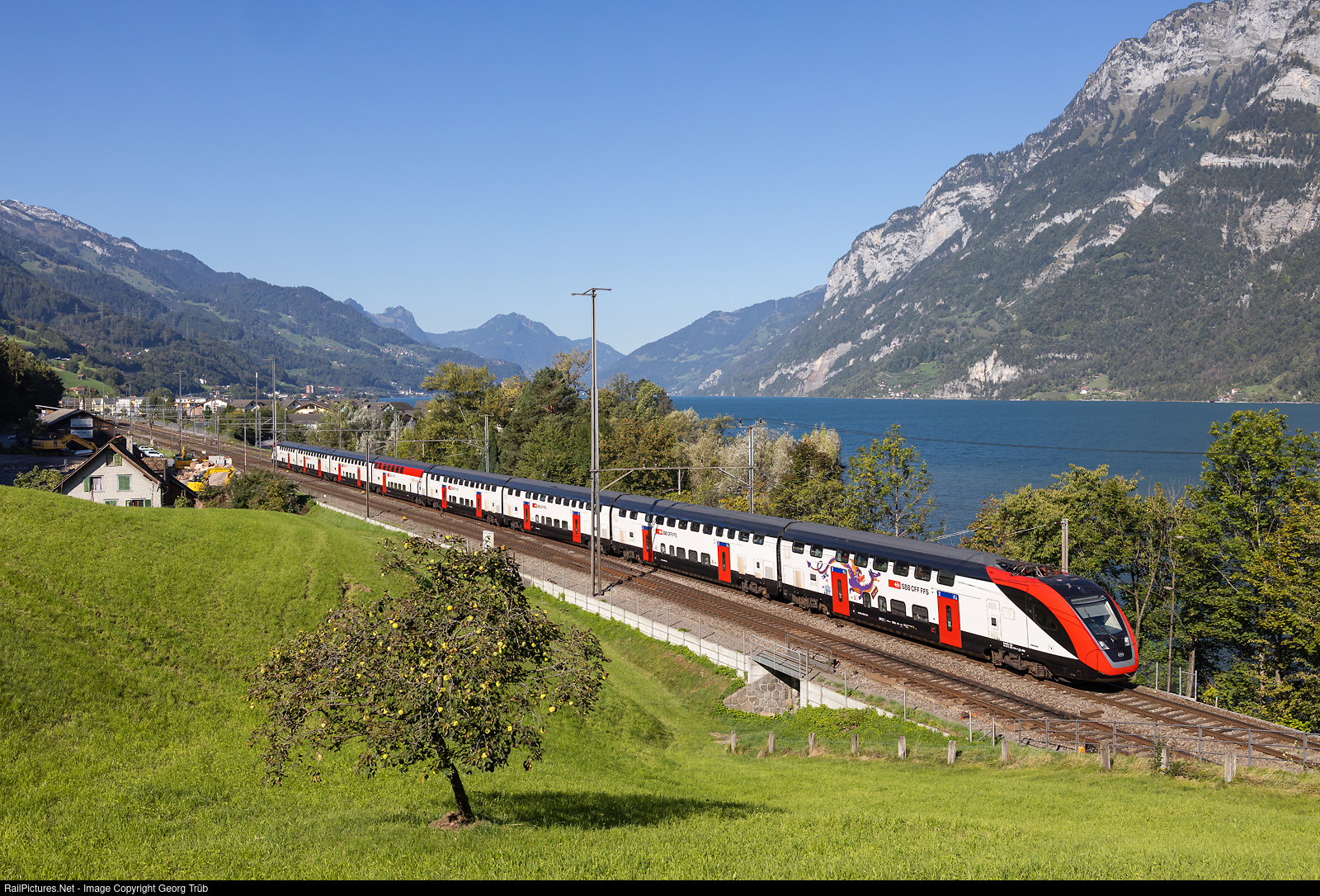| "FVD" (Fernverkehr Doppelstockzug/doubledeck train for long distance services) RABDe 502 # 016 (IC200 version) of the SBB is running the IC 563 of the line IC 3 from Basel via Zürich to Chur, along the Walensee at Unterterzen. |