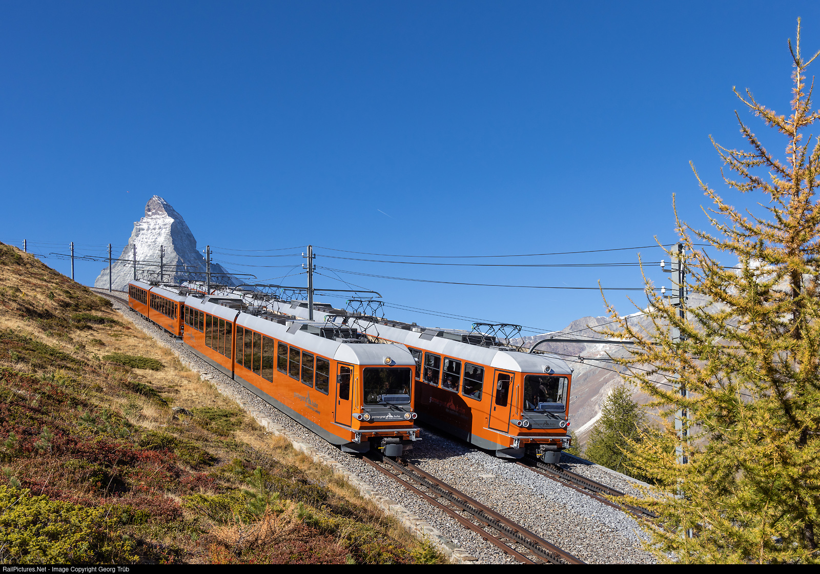 On the Gornergratbahn from Zermatt to the Gornergrat, in the 24-minutes interval timetable, the trains are crossing each others in Findelbach station, on the double track section Riffelalp to Riffelboden and on the double track section Riffelberg - Gornergrat. Trains CC 226 running down (left) with partly lowfloor railcars Bhe 4/6 # 3081 (StadlerRail 2006) and Bhe 4/8 # 3051 (SLM and ABB 1993) is meeting with uphill train CC 229 with railcars Bhe 4/6 # 3082 and Bhe 4/8 # 3052 between Riffelalp and Riffelboden, in front of the mighty Matterhorn.