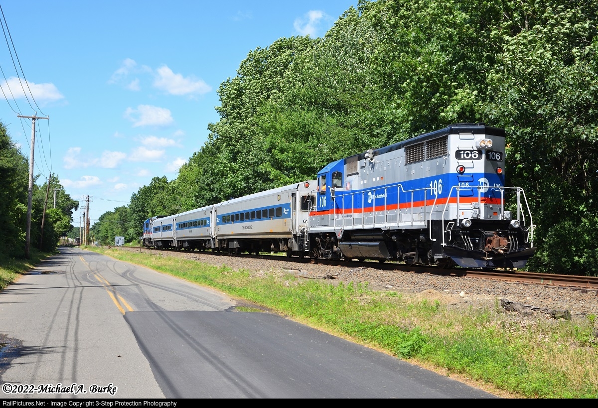 On Sunday, June 19, 2022, Metro-North train 6918 encountered mechanical issues with Brookville BL20GH 112 while en route to Waterbury. Alongside Oronoque Road in the Devon section of Milford, GP35R 106 tows the disabled mini-bomb equipment towards Stamford.