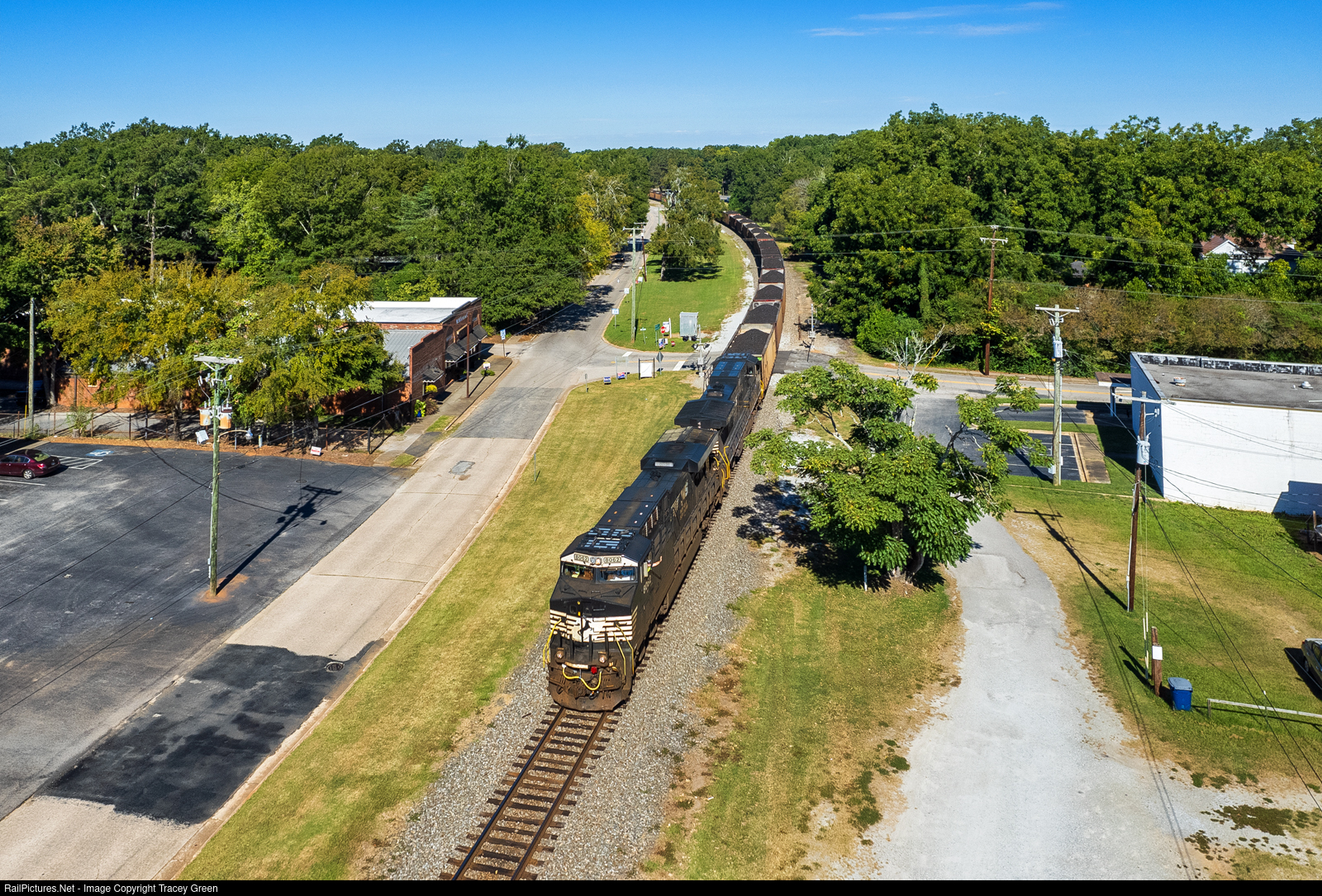 Loaded Coal. The recently renewed NS Wateree coal train, headed for Dominion Energy South Carolina's Wateree Station, passes through Ridgeway, SC. Conductor Daniel Gibbs, a local railfan, gives an excited wave as the train passes through this historic town.