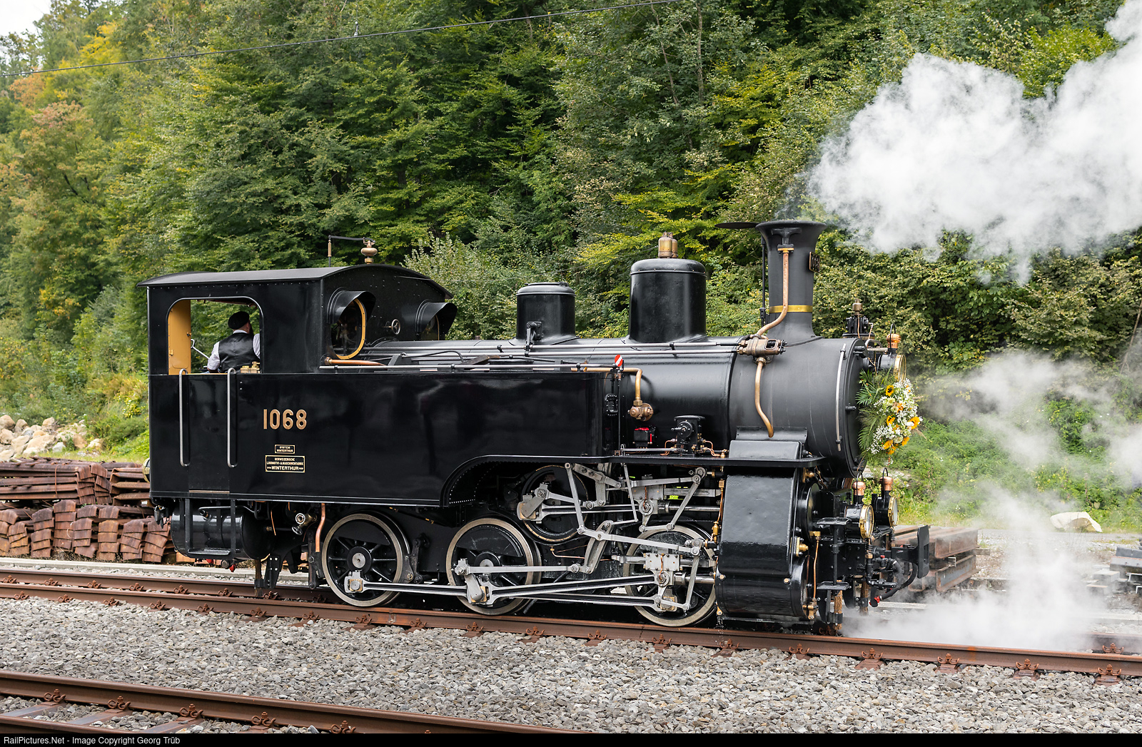 Cogwheel steamlocomotive HG 3/3 # 1068 of the Brünig Dampfbahn (former Ballenberg Dampfbahn) reached Giswil with a public passenger train from (Interlaken Ost-) Meiringen over the Brünig pass for the very first time since decades. The 0-6-0 T locomotive was built by the SLM Winterthur in 1926 for the 1 meter gauge Brünig line of the SBB, with Riggenbach rack system. In 1965 the steam traction on the Brünig line Lucerne-Meiringen-Interlaken Ost was officially terminated and the locomotive was put on display beside the station building in Meiringen. In 2000, the Ballenberg Dampfbahn was able to buy the locomotive from the SBB. From 2019 to spring 2022 the RhB workshop in Landquart rebuilt the HG 3/3 # 1068 operational again. There were several test runs in june and july on the line, which belongs to the Zentralbahn now. But the high wild fire risk in summer 2022 inhibited several planned joureys with the "new" locomotive, so this was the very first trip and the locomotive was adorned with flowers.