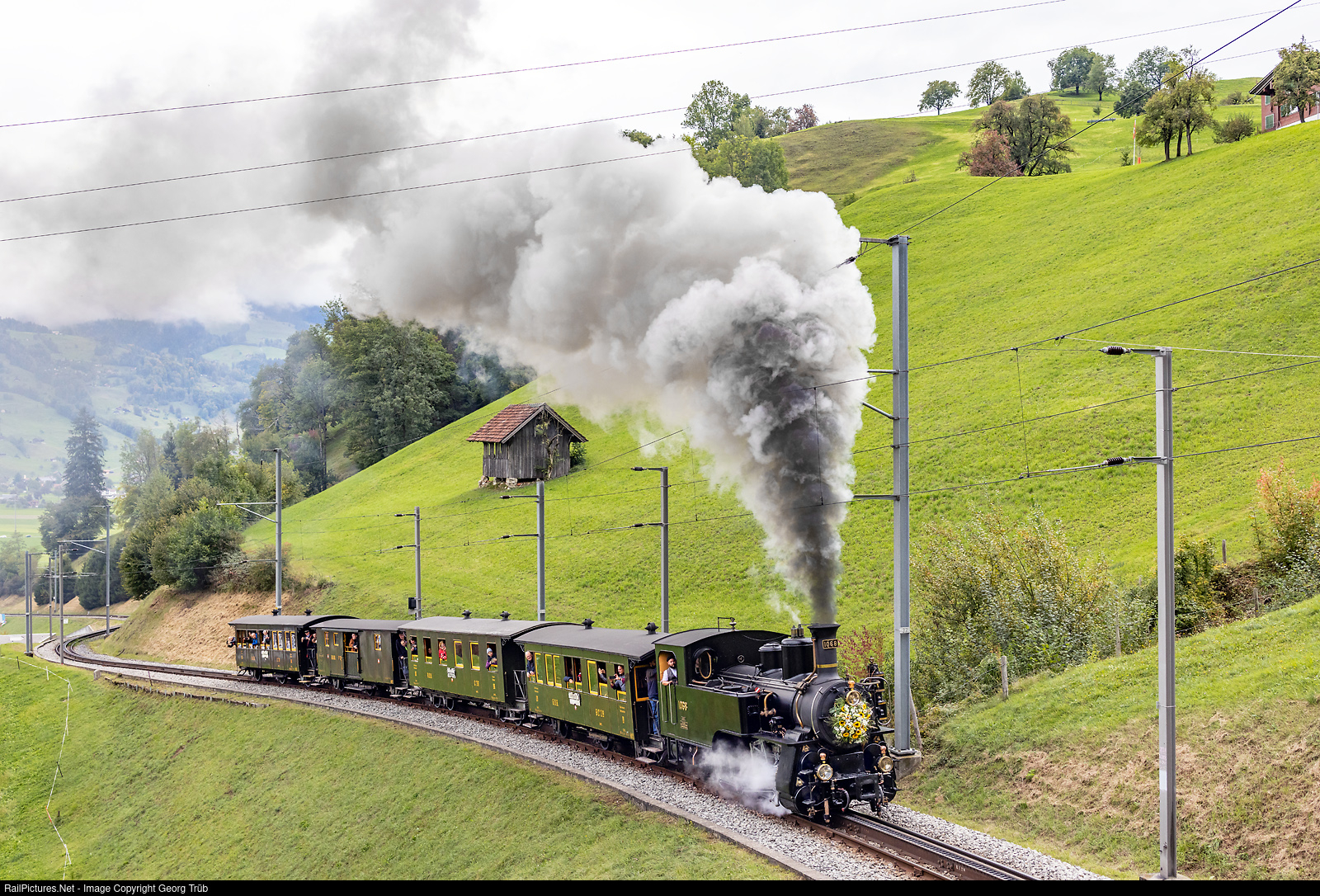 Cogwheel steamlocomotive HG 3/3 # 1068 of the Brünig Dampfbahn (former Ballenberg Dampfbahn) is tackling the 12.0 % grade of the Brünig pass line for the very first time since decades. The 0-6-0 T locomotive was built by the SLM Winterthur in 1926 for the 1 meter gauge Brünig line of the SBB, with Riggenbach rack system. In 1965 the steam traction on the Brünig line Lucerne-Meiringen-Interlaken Ost was officially terminated and the locomotive was put on display beside the station building in Meiringen. In 2000, the Ballenberg Dampfbahn was able to buy the locomotive from the SBB. From 2019 to spring 2022 the RhB workshop in Landquart rebuilt the HG 3/3 # 1068 operational again. There were several test runs in june and july on the line, which belongs to the Zentralbahn now. But the high wild fire risk in summer 2022 inhibited several planned joureys with the "new" locomotive, so this was the very first trip and the locomotive was adorned with flowers. The train of the Brünig Dampfbahn from Giswil via Meiringen to Interlaken Ost is between Giswil and Kaiserstuhl OW.