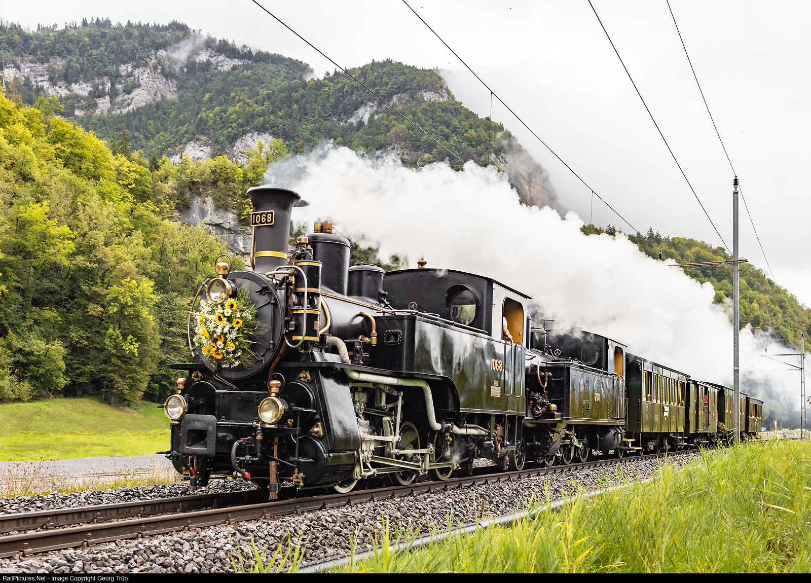 Cogwheel steamlocomotive HG 3/3 # 1068 together with G 3/4 # 208 of the Brünig Dampfbahn (BDB, former Ballenberg Dampfbahn) is pulling the steamtrain from Giswil to Interlaken Ost on the leg from Meiringen along the Brienzersee to Interlaken Ost, near Brienzwiler. The 0-6-0 T locomotive was built by the SLM Winterthur in 1926 for the 1 meter gauge Brünig line of the SBB, with Riggenbach rack system. In 1965 the steam traction on the Brünig line Lucerne-Meiringen-Interlaken Ost was officially terminated and the locomotive was put on display beside the station building in Meiringen. In 2000, the Ballenberg Dampfbahn was able to buy the locomotive from the SBB. From 2019 to spring 2022 the RhB workshop in Landquart rebuilt the HG 3/3 # 1068 operational again. There were several test runs in june and july on the line, which belongs to the Zentralbahn now. But the high wild fire risk in summer 2022 inhibited several planned joureys with the "new" locomotive, so this was the very first trip and the locomotive was adorned with flowers.