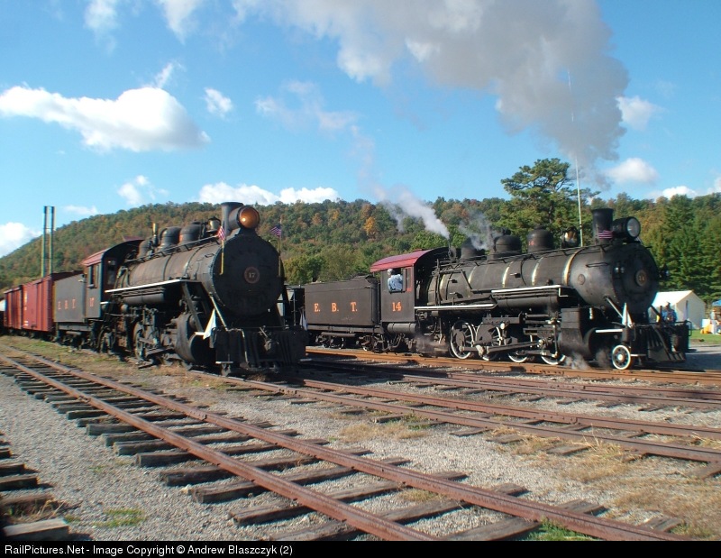| EBT 14, the only operating steam locomotive of the weekend, rolls past her sister #17 who is on display. |