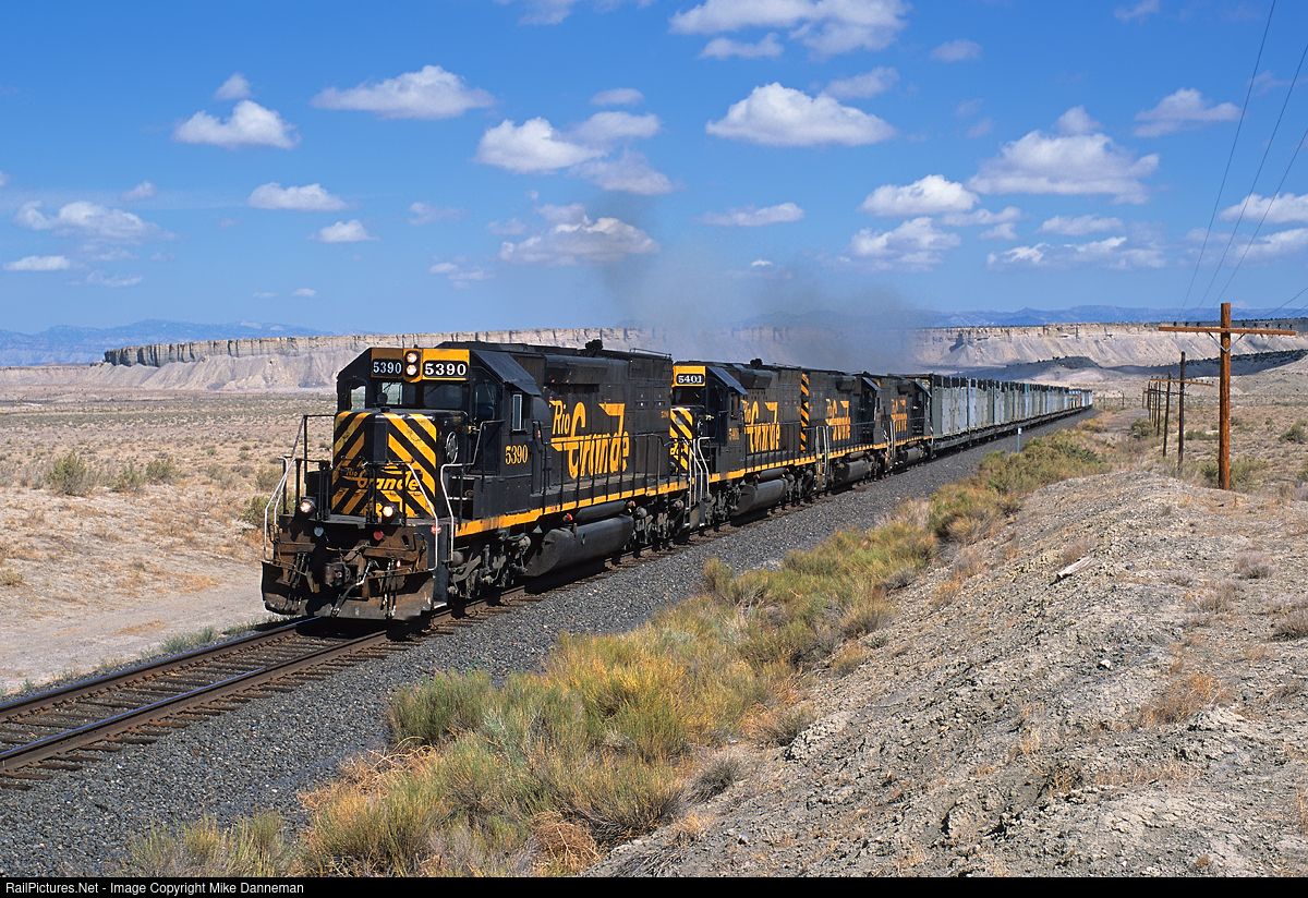 By mid-2002, there were still 47 former Rio Grande EMD SD40T-2s running on the Union Pacific system, but only seven were not patched or painted yellow. At this time, a quartet called Helper, Utah, home and could be found running on the local that operated to East Carbon on the Sunnyside branch and return. On July 26, 2002, the “Gang of Four” as they became known, passes mile 606.7 west of Mounds, Utah, with UP local LJP45. Rio Grande Nos. 5390, 5401, 5377 and 5371, equalling 12,000 hp worth of aging black Tunnel Motors, storm by on the warm summer morning.
