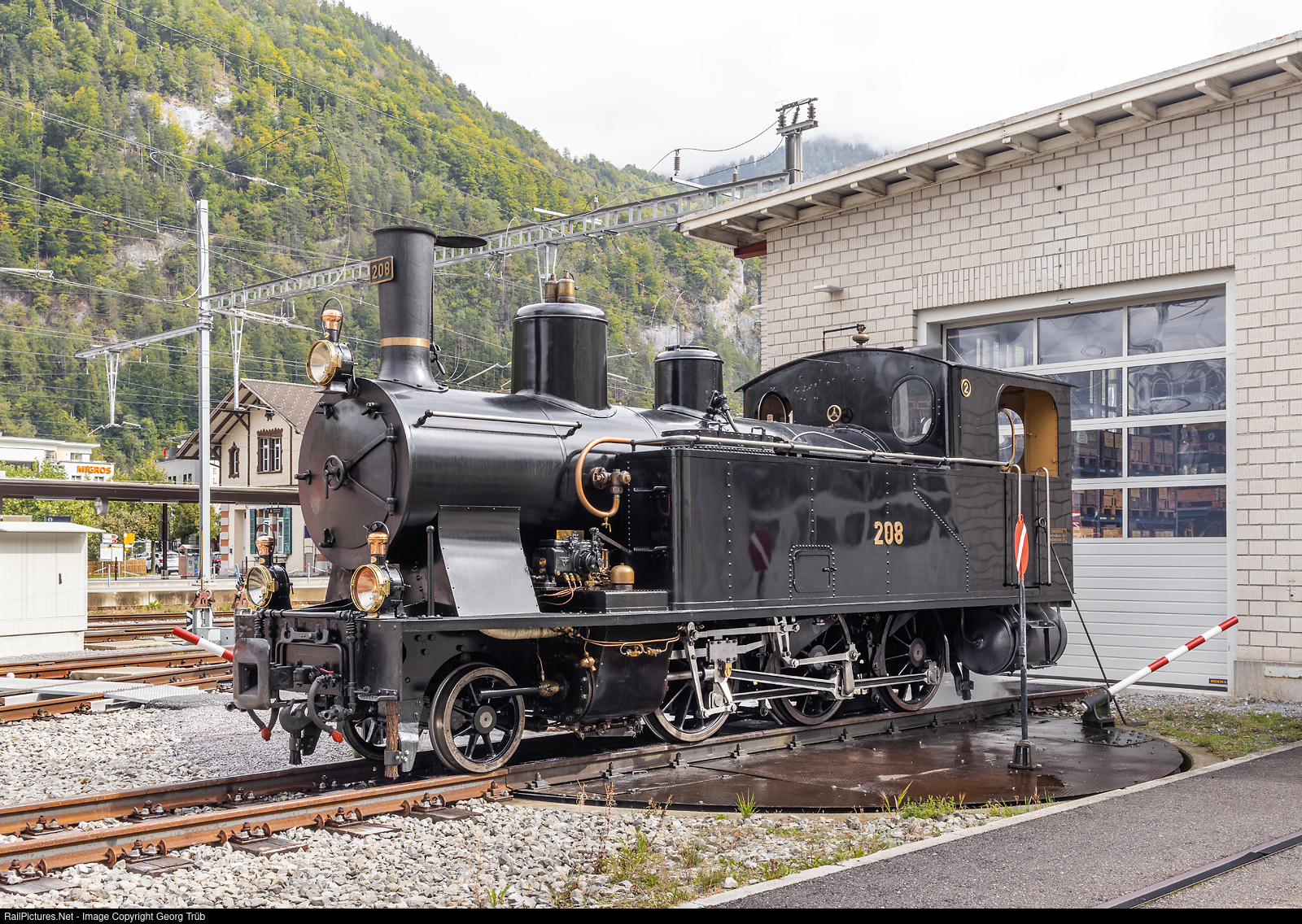 2-6-0 T "Mogul" steamlocomotive G 3/4 # 208 of the Brünig Dampfbahn (BDB) on the turntable in Meiringen. The locomotive pulled the steamtrain from Interlaken Ost this morning, which is now running over the Brünig pass with cogwheel locomotive HG 3/3 # 1068. The # 208 was built by the SLM in 1913 for the 1 meter gauge Brünig line of the SBB and has a maximum velocity of 60 km/h. Withdrawn in 1965 and taken over by Verein Freunde der Dampflok Kägiswil, since 1974 with the association Ballenberg Dampfbahn, which was renamed to Brünig Dampfbahn in 2022.