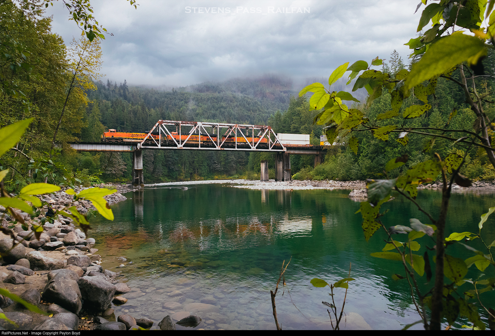 | The Clouds are low and the River is quiet as me and 2 friends wait and listen for the "morning Z's" horn in Gold Bar. As we hear the horn we prepare our Cameras and get our framing right, eager to get the shot. The engines get less faint and we start to realize the train is just around the corner. Suddenly it pops out from the Trees, rushing onto the Bridge and crossing the River. In just a blink of an Eye the power is gone back into the Trees. We take a peek at our shots then run to the car as we are discussing where we should shoot next. Good times on Stevens Pass... |