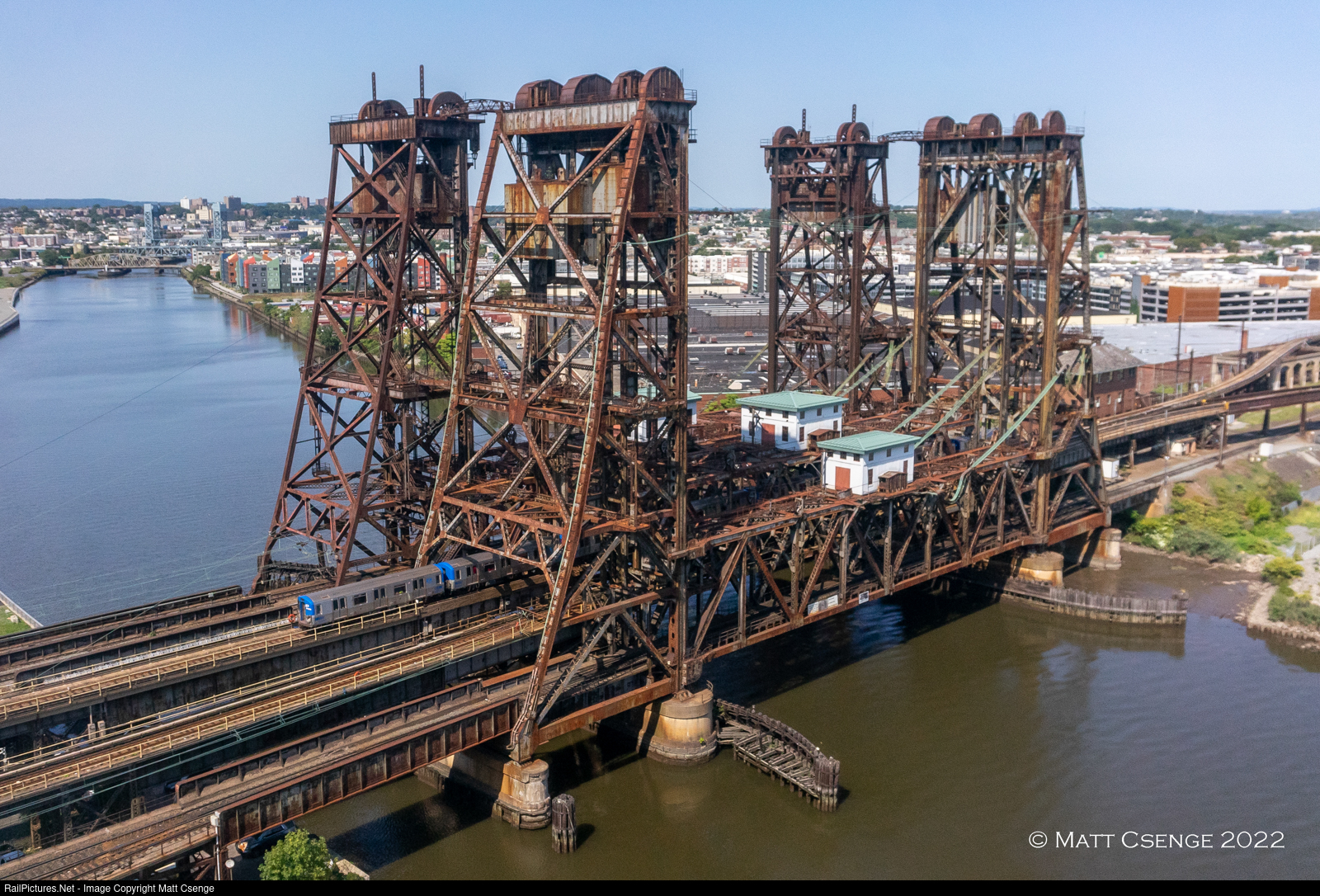 A Port Authority Trans-Hudson (PATH) train to Newark is seen crossing the Dock Bridge over the Passaic River. This immense structure was built in the 1930s (west span 1935, east span 1937) and carries 6 tracks across the river, 3 on each of the two bridges that make it up. The train is made up of PA5 cars manufactured by Kawasaki from 2008-2022. |