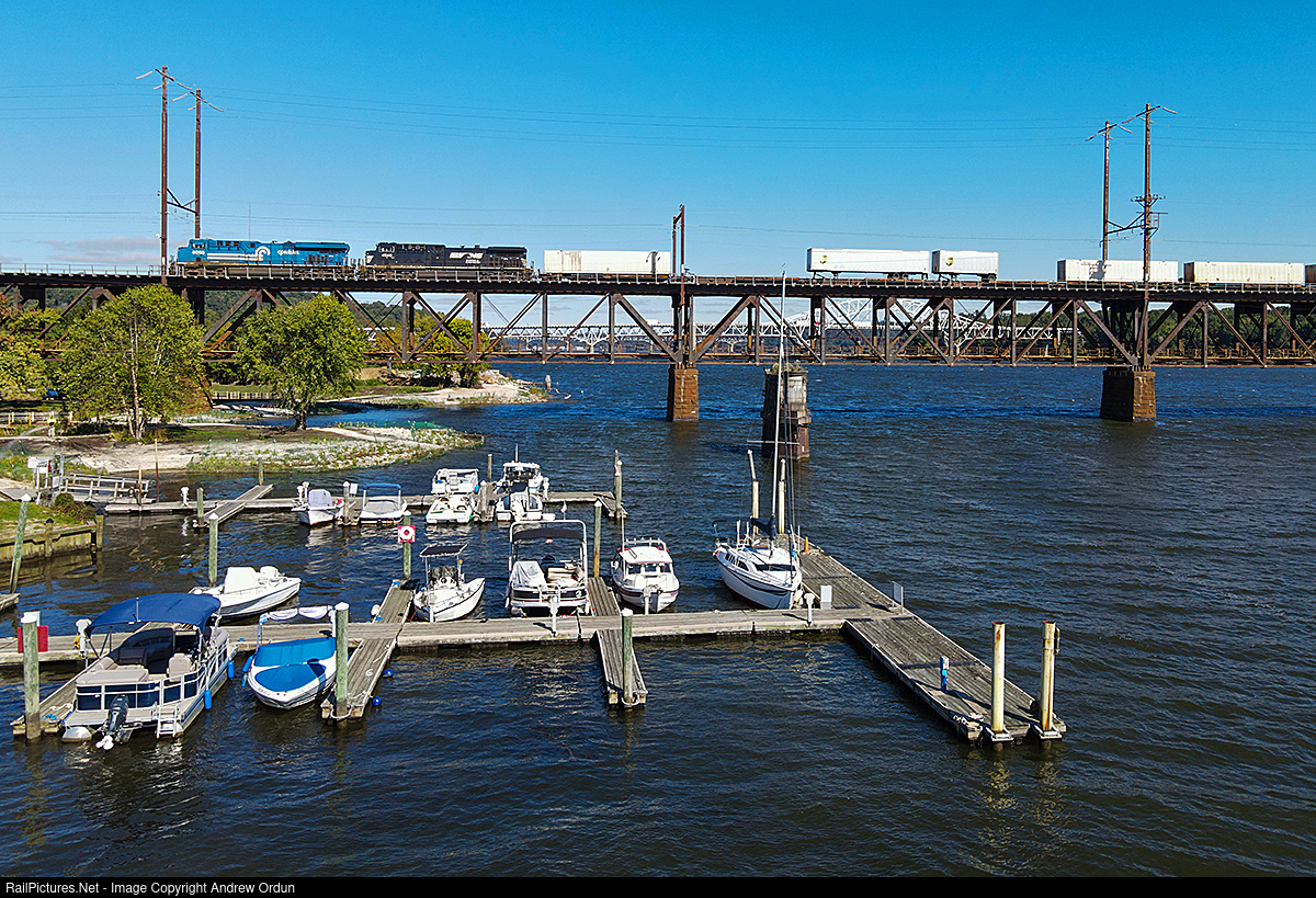 28V with the Conrail heritage unit on the point crosses the Susquehanna River.