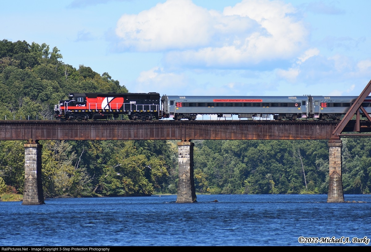 CTrail train 4407 crosses the Connecticut River in Enfield. The train is led by GP40-3H 6695 and is heading for New Haven.