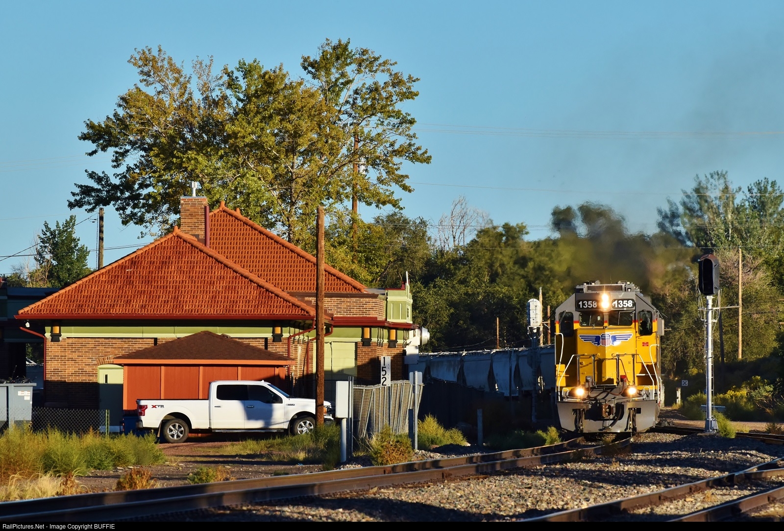 UP 1358 (GP40N) runs past the historic Rio Grande Depot in Florence, Colorado.