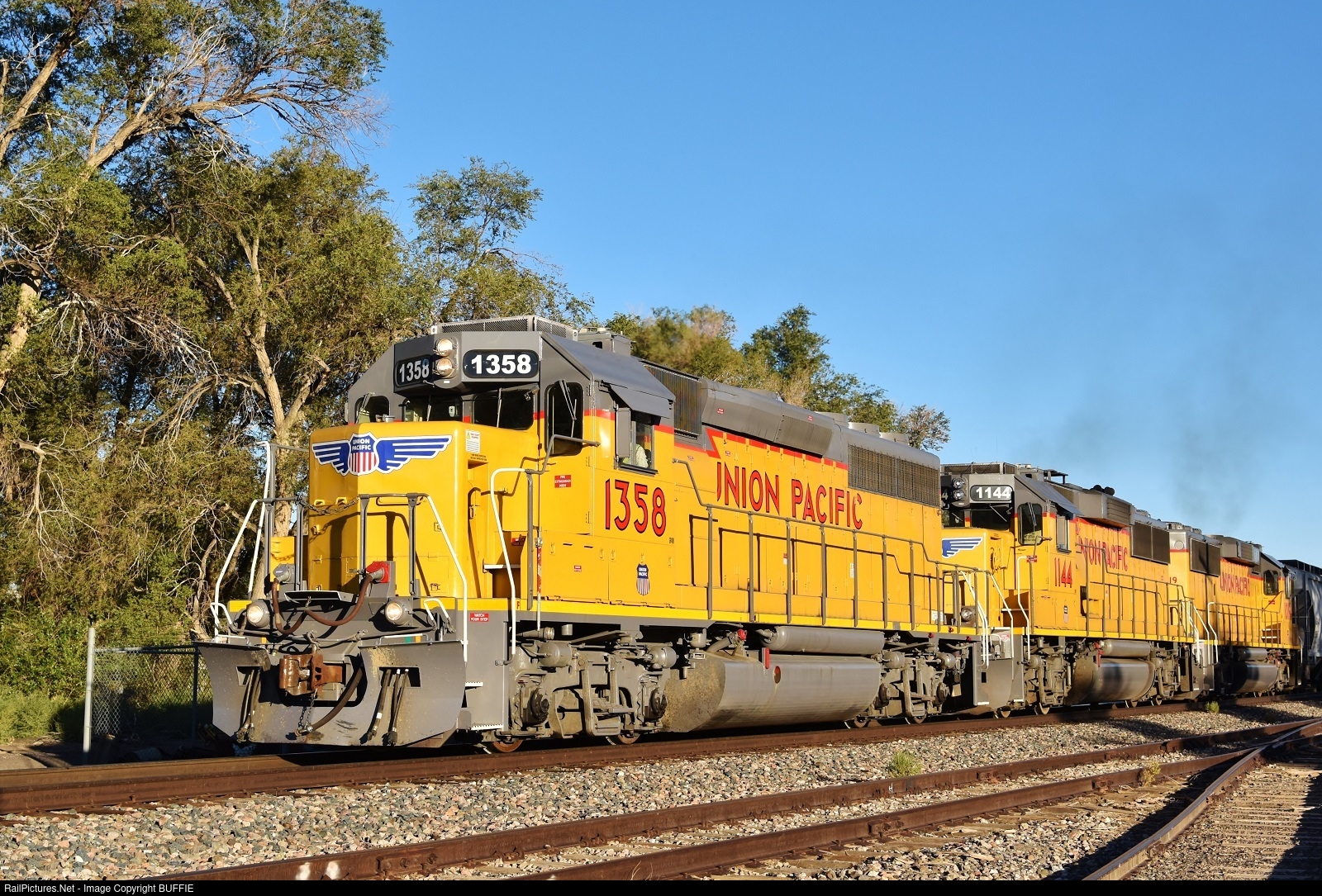 | A trio of light power, including UP 1358 (GP40N), runs a cut of hoppers into a yard at Florence, Colorado.