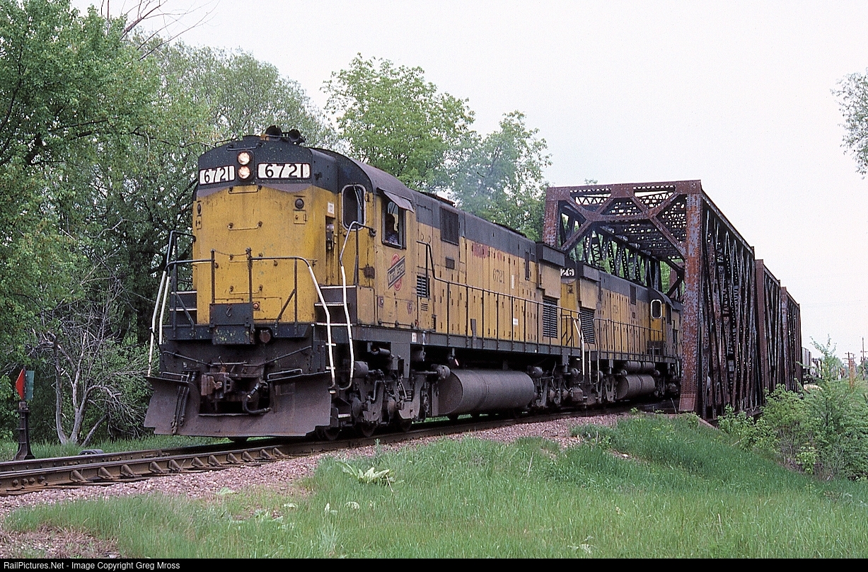 CNW 6721 brings train ESGBA across the Peshtigo River in Peshtigo, WI. in May of 1986. Peshtigo was the site of the worst wildfire in US history in October of 1871. The fire claimed more than 1200 lives but was overshadowed by the Great Chicago Fire that happened on the same night.