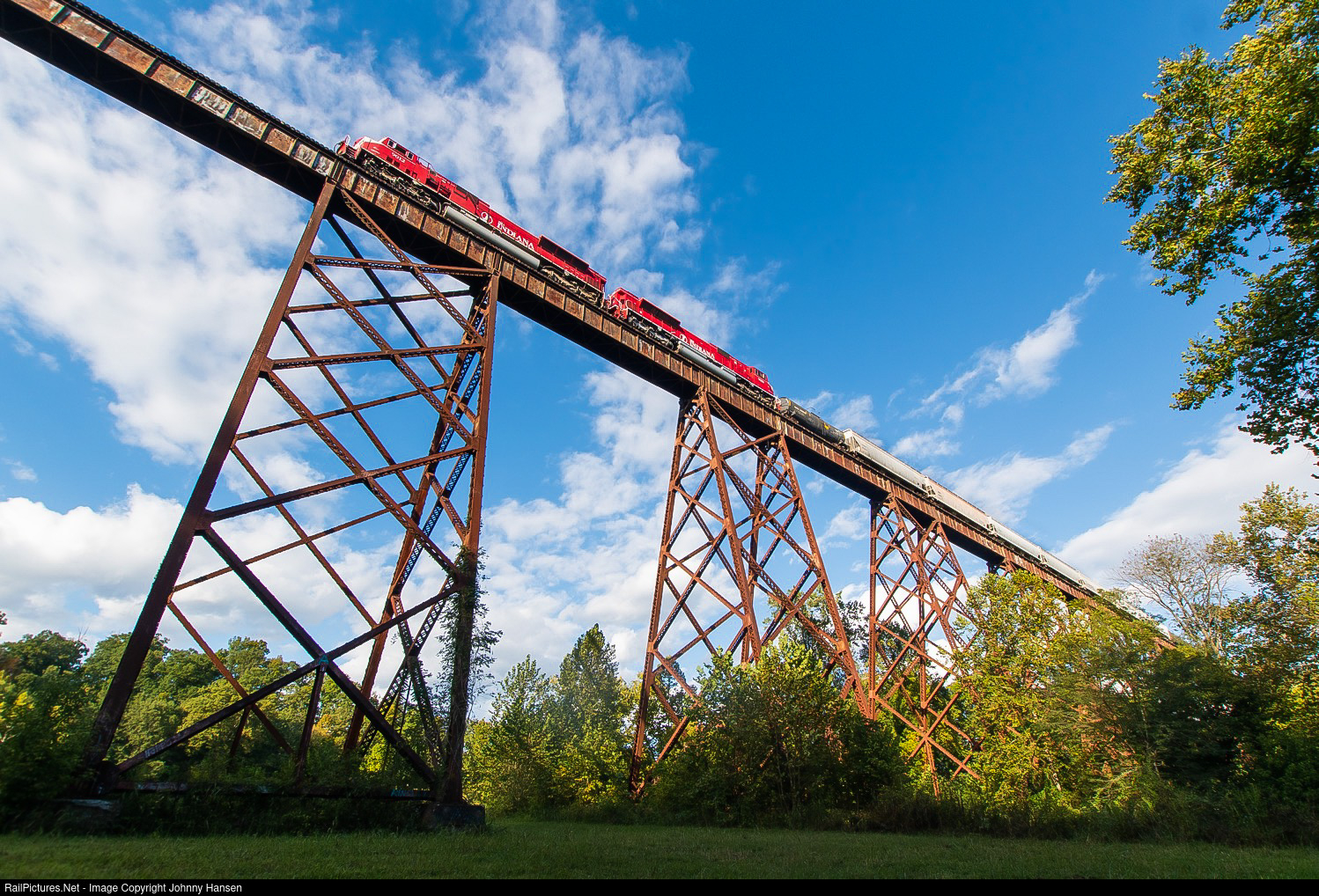 The trestle Itself Is famous to the State of Indiana; as It was built in 1905 by the Indianapolis Southern Railway, which became part of the Illinois Central Railroad in 1911. It is 2,295 feet in length and is the biggest railroad bridge in all of Indiana. The Tulip Trestle is the biggest trestle along the old Illinois Central Hi-Dry Line as well. The close-up wide angle I took here really shows how big the trestle is. |