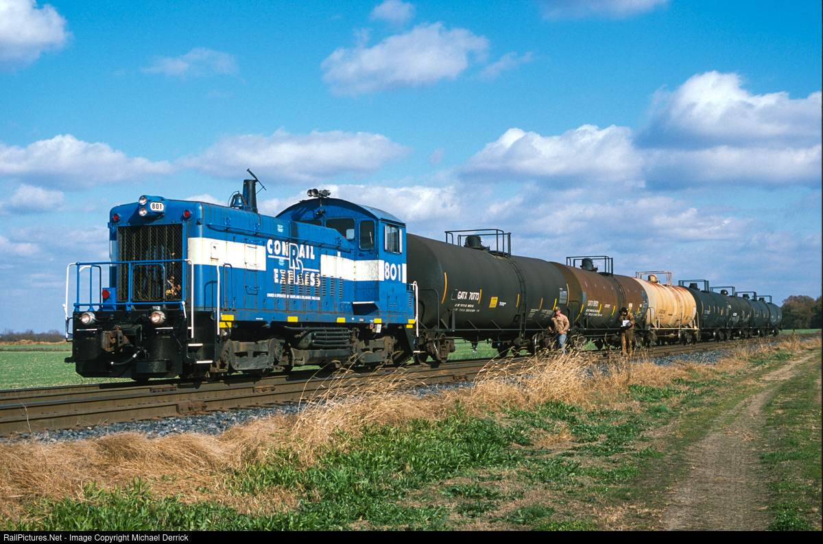 I certainly didn't plan it that way, but a neat shot from 11-11-11. The lone survivor of a very short-lived Conrail marketing plan-- Conrail Express. Much as airlines do with their regional partners, this was envisioned as a program of Conrail-branded shortline partners, leveraging the mainline partner's marketing resources to provide a stronger product. It didn't last long, with only two units painted-- Reading & Northern 2795 (which was soon after wrecked and retired) and MDDE 801, which is still in use to this day.