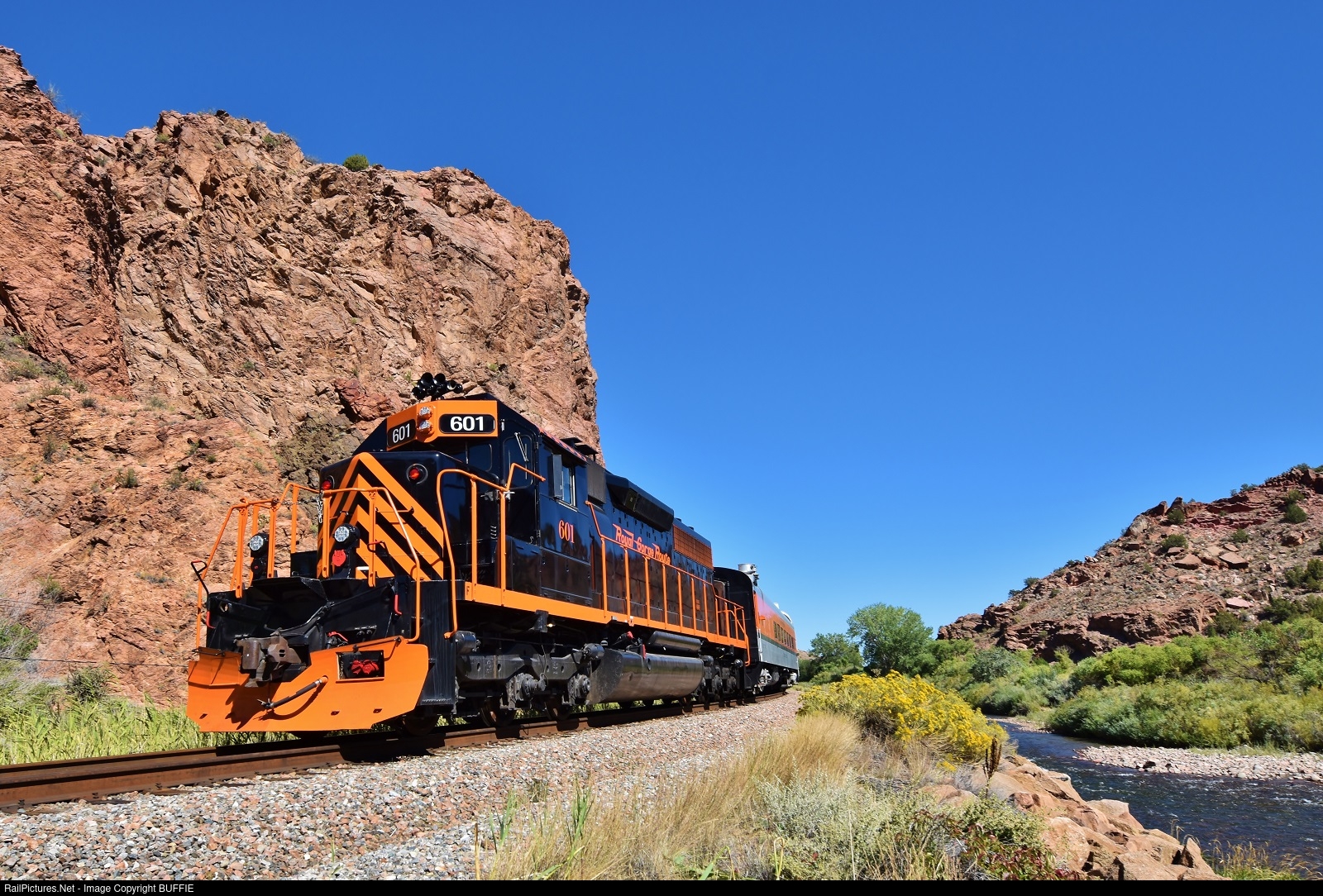 | Royal Gorge engine #601 (GP40-3) leads the passenger train into the Royal Gorge Canyon west of Canyon City, Colorado.