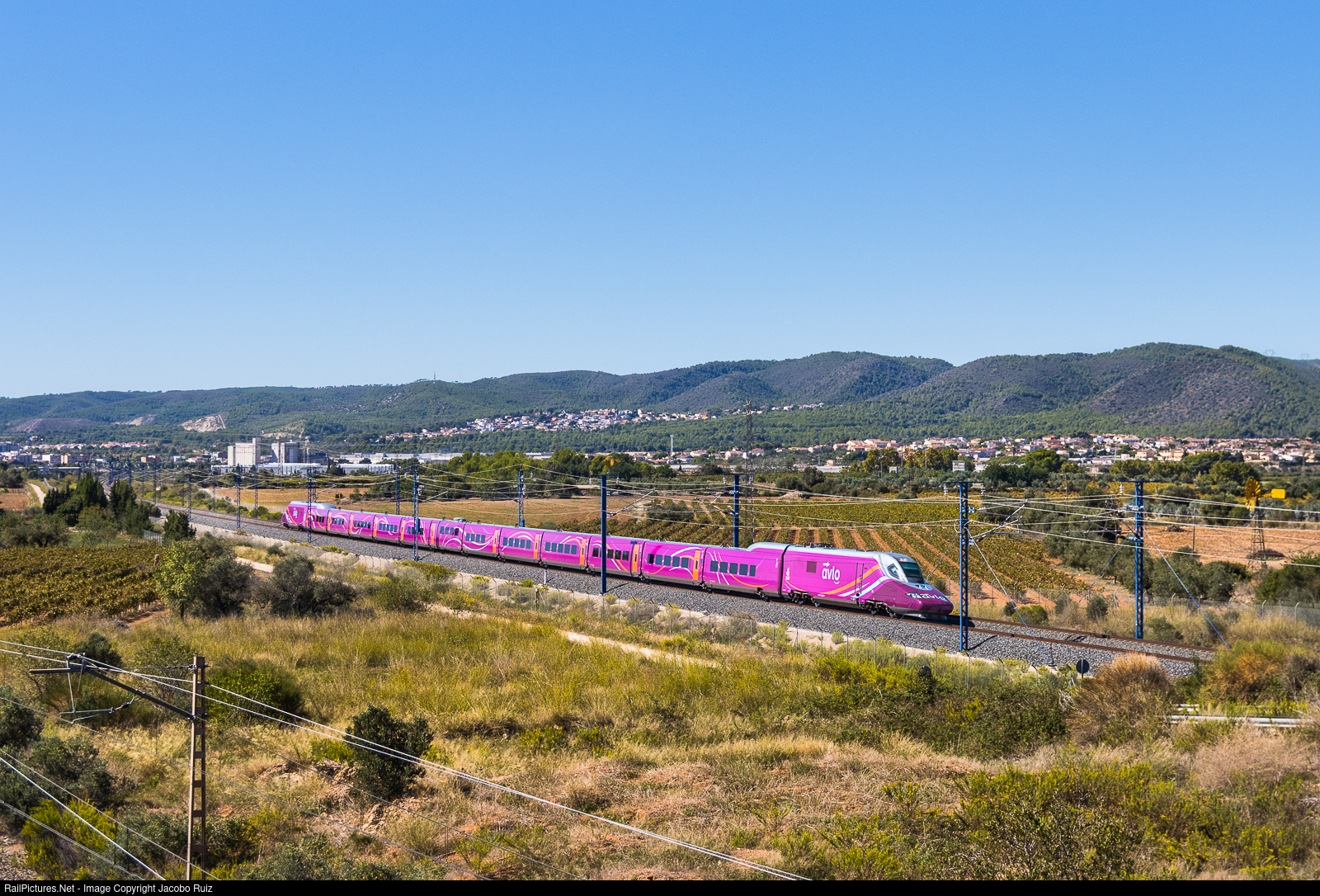 High-speed, low-cost train covering the route Madrid (Atocha station) - Barcelona (Sants station). In the image, as it passes through the municipality of Bellvei, about 70 km away from Barcelona.