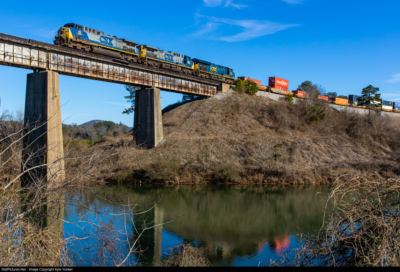 | Northbound intermodal train Q142 (Jacksonville,FL - North Baltimore,OH) cruises across the Etowah River |