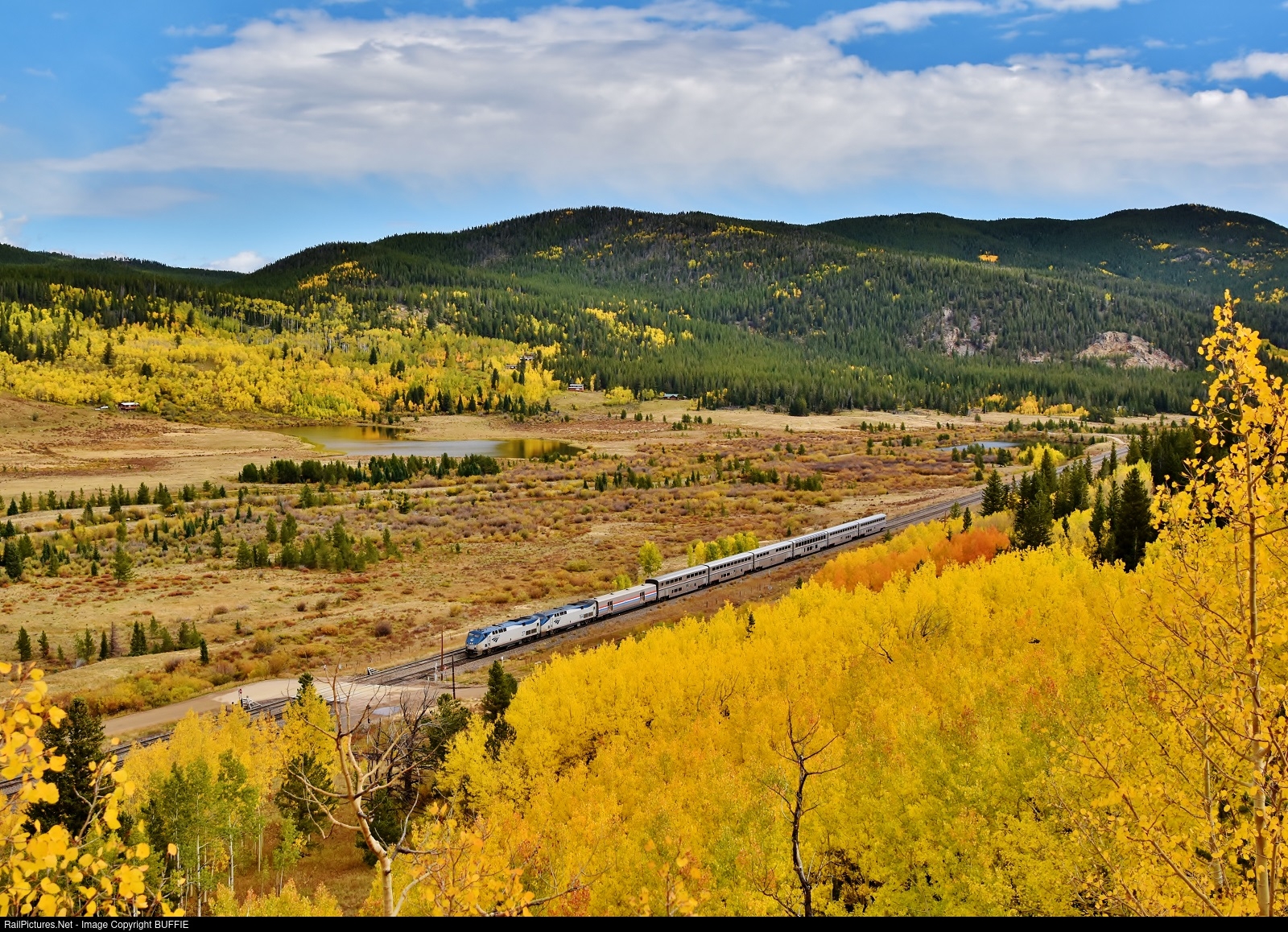 | After leaving Denver, Colorado an hour late, the California Zephyr arrives in Tolland and glides among the golden aspen trees lining the valley.