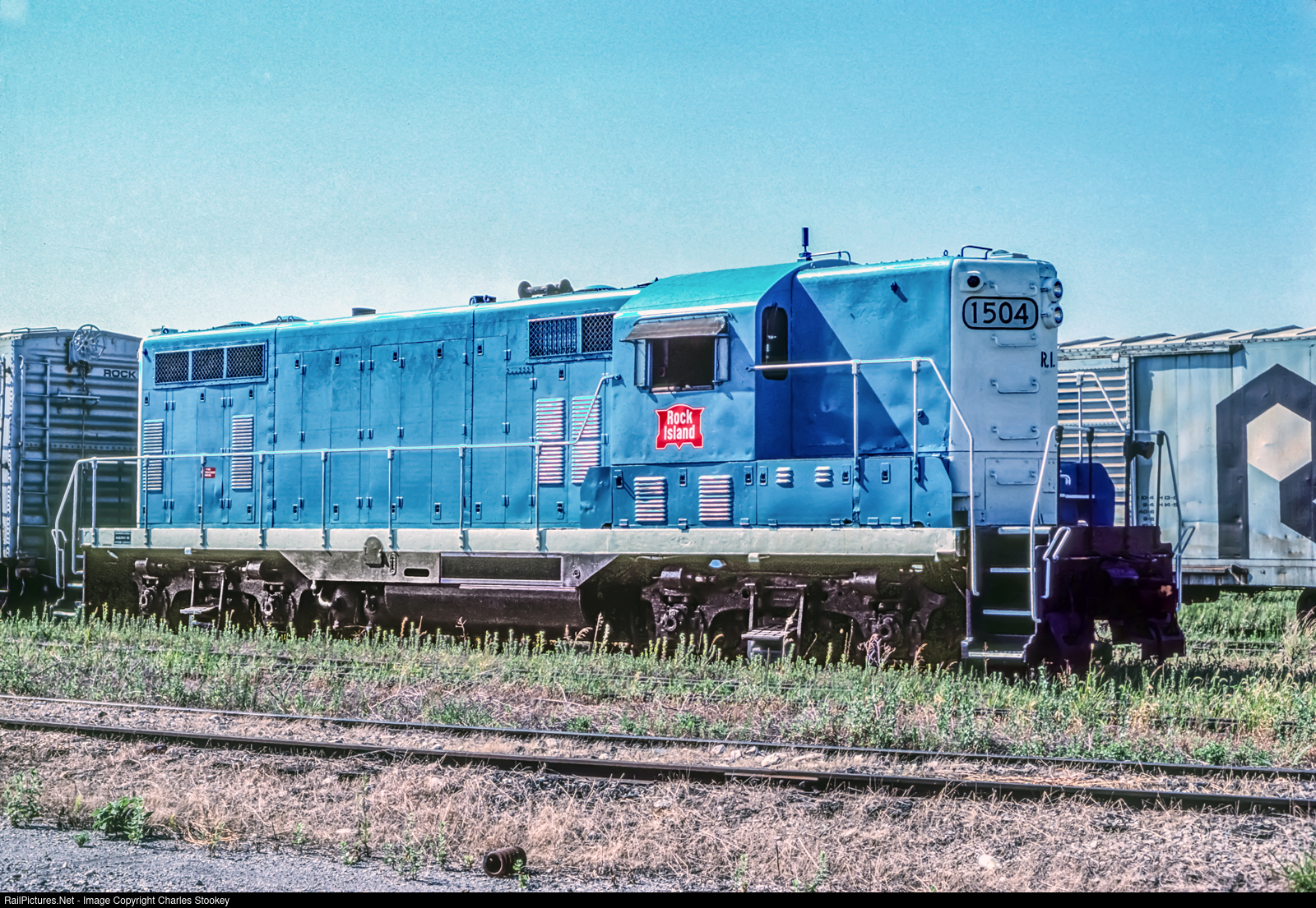| EL RENO OK August 15 1983 - CRIP GP71504 sits at the ready to depart the shops area. The unit was leased by the bankruptcy trustee for use cleaning up Rock Island property after the final shutdown. It was sad to see this locomotive go about its chores of removing Rock rolling stock. My photo.