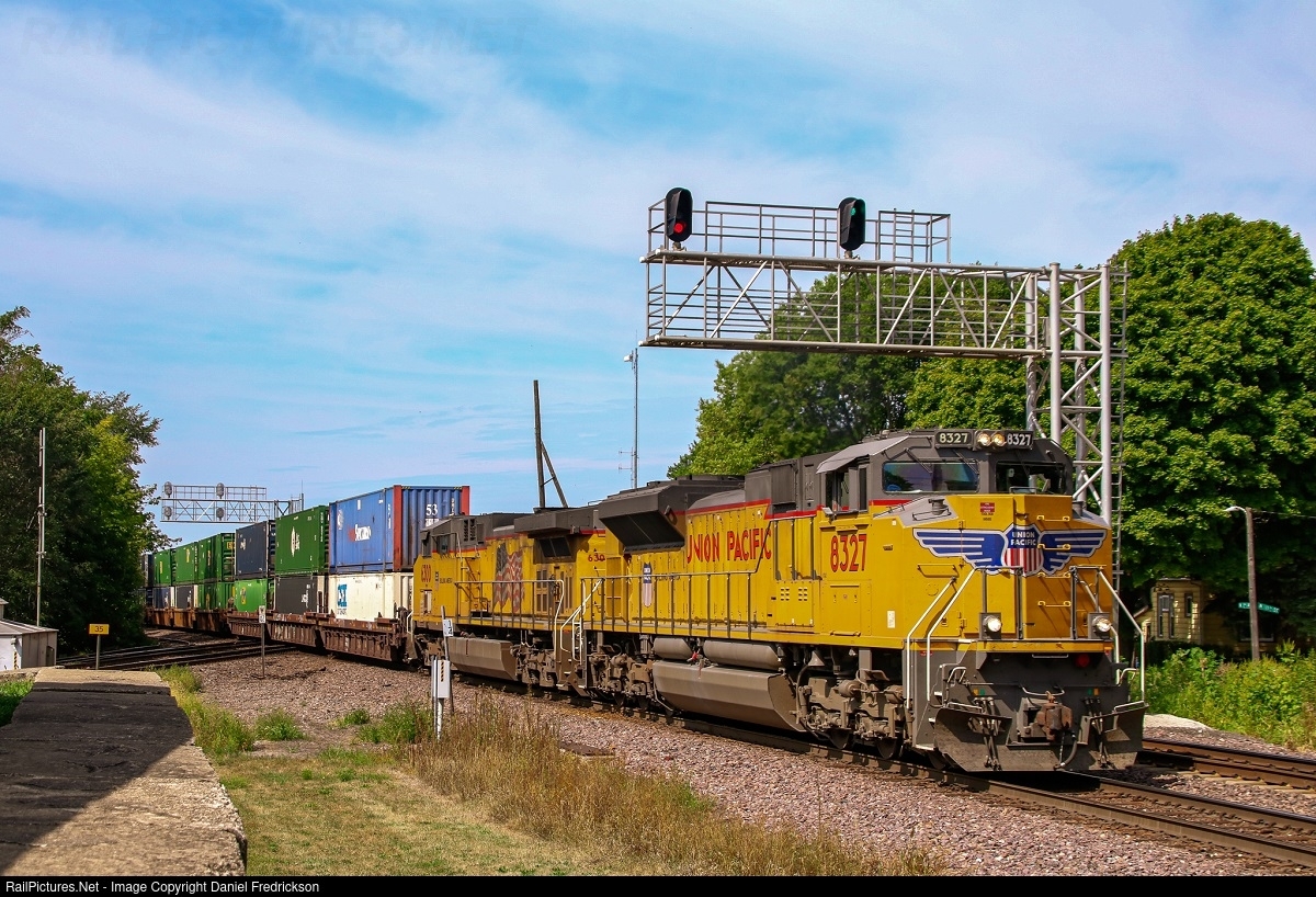 | UP 8327, one of the few SD70ACes repainted without the American flag on the flank, leads a stack train out of Global 3 in Rochelle, IL. |