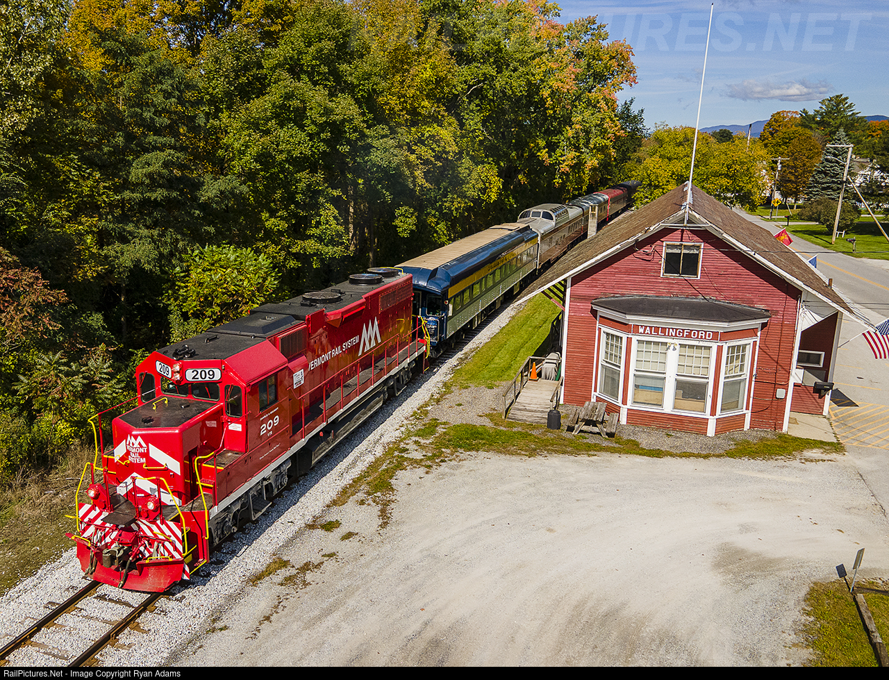 | As the clouds finally move on for the day, the bright sunshine shines down on the AAPRCO American Autumn Explorer as it passes the old Wallingford depot, now fire station. |